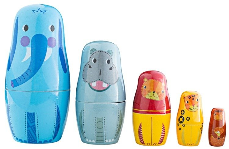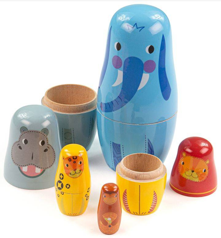 Urocze matrioszki Tidlo to drewniane i pięknie pomalowane figurki na wzór tradycyjnych Rosyjskich laleczek. Komplet pięciu figurek przedstawiających zwierzęta z dżungli od największej dostojnego słonia do najmniejszej figurki małpki. Wśród nich znajduje się również lew, tygrys i hipopotam.