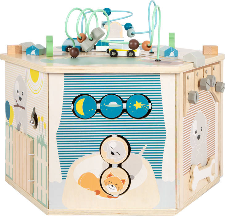 Kostka motoryczna Zwierzaki Small Foot to rodzaj drewnianej zabawki edukacyjnej składającej się z 8 ścian. Na każdej z nich inna zabawa dla dzieci ćwicząca motorykę, logiczne myślenie oraz rozpoznawanie kolorów i kształtów. Przesuwane koraliki, labirynty, gry w dopasowywanie kształtów i sortowanie kolorów oraz budowanie zapewnią zabawę na dłuższy czas. Pokrywa kostki pełni funkcję tablicy do rysowania, a ilustracje zwierząt domowych spodobają się wszystkim miłośnikom czworonogów. Wnętrze skrzyni to mnóstwo miejsca do przechowywania zabawek oraz drobiazgów. Nóżki zabawki posiadają gumowe osłonki, dzięki czemu możemy być spokojni o nasze podłogi. Stabilna konstrukcja pozwala na bezpieczną zabawę, a propozycje aktywności znajdujących się na każdej ścianie kostki to gwarancja wszechstronnego rozwoju naszych pociech.