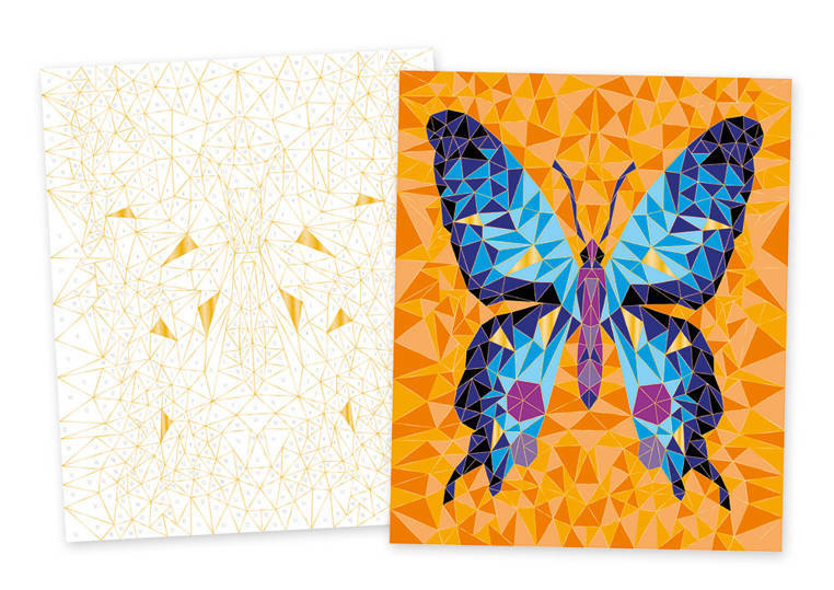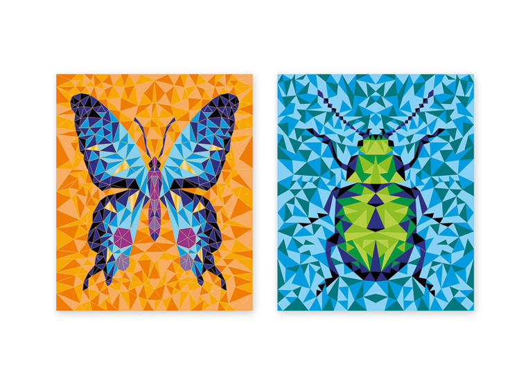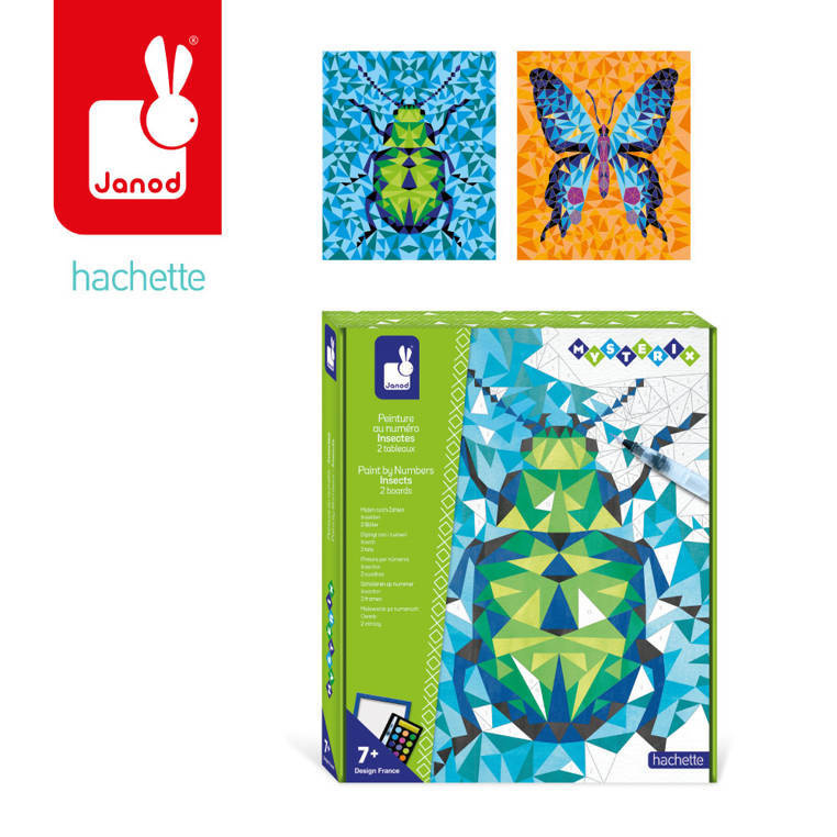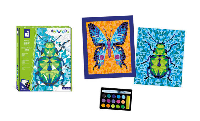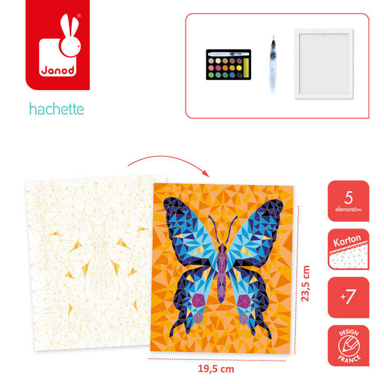 Twój 7, 8 letni lub nieco starszy Skarb posiada duszę artysty i ciągle potrzebuje rozwijać się w dziedzinie sztuki? Mamy dla niego doskonałą propozycję! Zestaw kreatywny Malowanie po numerach Owady Misterix francuskiej marki JANOD składa się z 2 plansz obrazkowych, z barwnymi owadami -motylem i żukiem. Plansze są białe, a jedna z nich posiada złote elementy. Zostały one podzielone na ponumerowane trójkątne przestrzenie, a ilustrację zauważyć można dopiero podczas malowania. Dziecko będzie miało za zadanie za pomocą dołączonego specjalnego cienkiego pędzelka ze zbiornikiem wody wypełnić przestrzeń farbą, zgodnie z instrukcją numeryczną. Do dyspozycji jest 15 kolorów akwareli oraz mała gąbka, która bez problemu pochłonie nadmiar wody. W zestawie nie zabraknie także ramki, którą można pomalować na dowolny kolor. Malowanie po numerach jest czynnością bardzo angażującą i pochłaniającą dzieci. Jednocześnie nasze pociechy będą czuły się wyciszone i uspokojone. Stworzone dzieła sztuki będą zaś zdobiły dziecięcy pokój. Ten zaprojektowany we Francji zestaw idealnie nadaje się na prezent dla chłopca i dziewczynki.