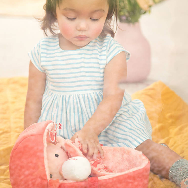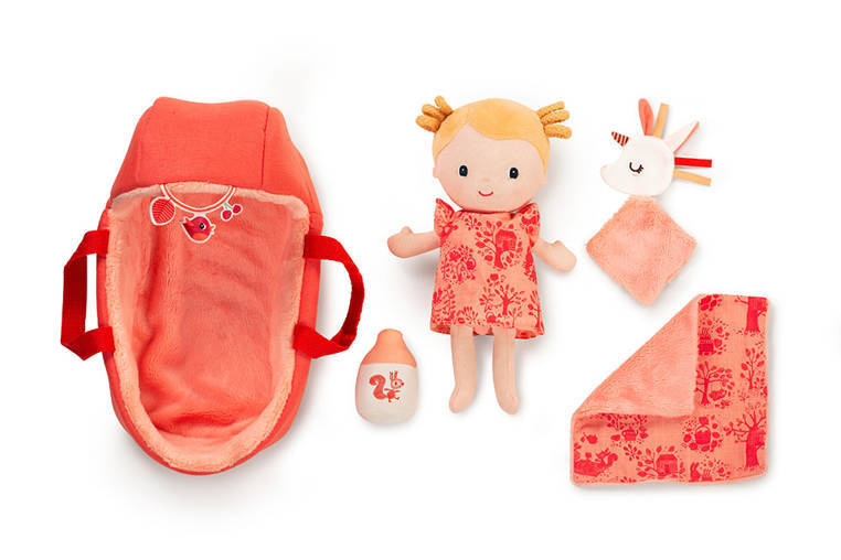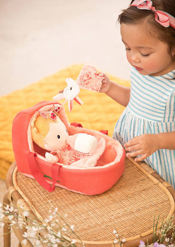 Ta miękka przytulanka z akcesoriami to kolejna propozycja miłej w dotyku laleczki - dzidziusia od belgijskiej marki Lilliputiens. Ta oryginalna maskotka przybrała postać uroczej laleczki - dziewczynki. Dzidziuś bardzo potrzebuje aby się nią zaopiekować, w zamian zostanie najlepszą przyjaciółką dziecka. Zestaw składa się także z kompletu akcesoriów pomocnych w zasypianiu. Jeśli maluszek lubi naśladować dorosłych, to ten mięciutki komplet jest przeznaczony właśnie dla niego. Zestaw okaże się pomocny nie tylko do uspokajania, tulenia czy zasypiania. Maluch zabierze swoją dzidzię na spacer lub gdziekolwiek zechce. Oprócz ślicznej dziewczynki, zestaw obejmuje jeszcze zdejmowaną brzoskwiniową sukienkę z wzorem w drzewka jak również zawiera różową pieluszkę. Jeśli chodzi o twarzyczkę dzidzi, to oczy i buzia lalki są wyszywane. Upiększają ją także miękkie, jasne włoski z weluru uczesane w dwa koczki. Z kolei dwustronna i bardzo mięciutka gondola z daszkiem, łańcuchem z naszywkami oraz rączkami do przenoszenia, zapewnia bobasowi olbrzymi komfort wypoczynku. Projektant zabawki wykazał się olbrzymim sprytem, dodając do zestawu dwustronny kocyk, który pełni także funkcję przewijaka. Maluch otrzyma także mini komforter-jednorożec oraz pluszową butelkę mleka z magnesem, który umożliwia przykładanie jej do buzi laleczki odgrywając scenkę karmienia. To idealna zabawka do zabawy w przygotowania do snu. Całość została wykonana z dbałością o szczegół, jest komfortowa w użytkowaniu i w 100% bezpieczna. Zabawa z tą przyjemną w dotyku maskotką aktywizuje zmysł dotyku. Jej wyjątkowy design i kolorystyka sprawiają, że ta pluszowa lalka z akcesoriami mocno przykuwa dziecięce spojrzenia aktywizując przy tym ich zmysł wzroku i rozwijając wyobraźnię. Poprzez wykonywanie czynności jak np. unoszenie lub chwytanie, dzieci rozwijają małą motorykę. Na dodatek zabawka aktywizuje także sferę uczuciową maluszka. Ta stworzona z najwyższej jakości materiałów lalka może stanowić interesujący podarunek dla dziecka.