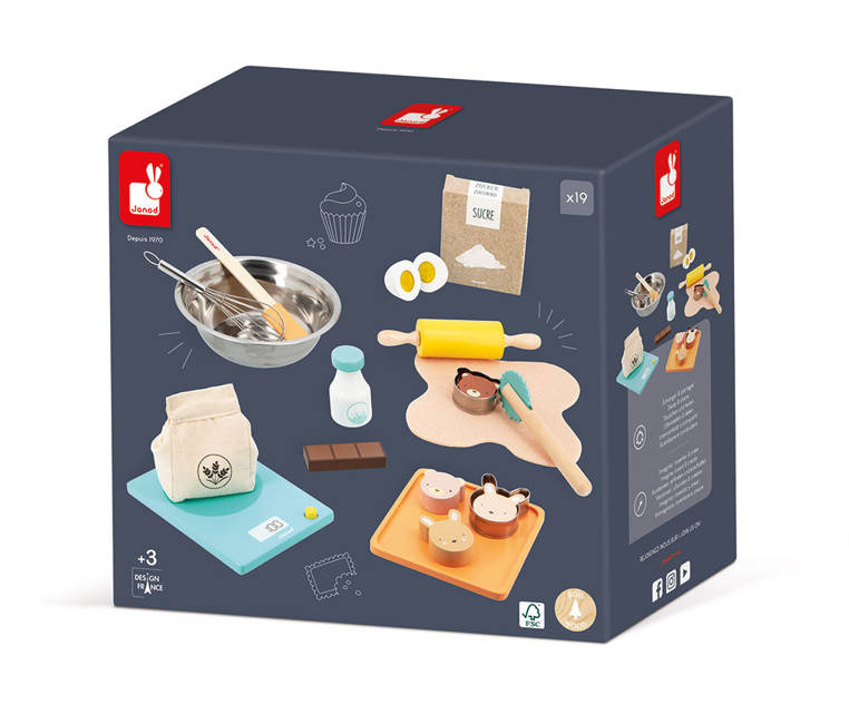 Drewniany zestaw Warsztat cukierniczy JANOD składa się z 19 elementów i sprawi mnóstwo radości każdemu dziecku. Pozwoli na bezpieczne uczestniczenie dziecka razem z rodzicem w codziennych kuchennych czynnościach i rozwijanie pasji gotowania. W skład zestawu Janod wchodzą: mąka w lnianym woreczku, karton cukru, pasek czekolady, butelka mleka, jajko składające się 2 części z żółtkiem-rzepem do ich łączenia, rozwałkowane ciasto, cztery ciasteczka (dwa misie i dwa zajączki), drewniana waga kuchenna, wałek, metalowa miska z rózgą do wyrabiania ciasta, szpatułka, wykrawaczka oraz tacka do serwowania. Większość elementów zestawu warsztatu cukiernika Janod wykonana została z drewna FSC pozyskanego z lasów zarządzanych w zrównoważony sposób i pomalowana bezpiecznymi dla dzieci farbami. Tego typu produkty stanowią świetne uzupełnienie każdej dziecięcej kuchni.