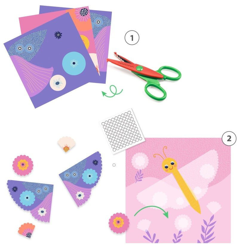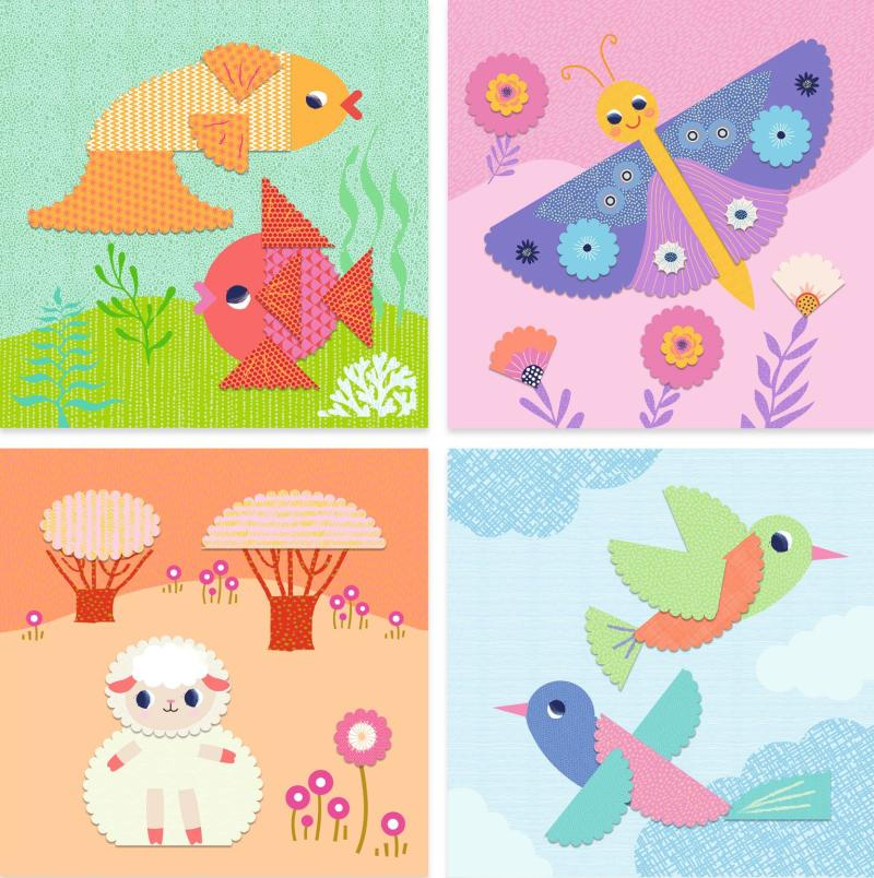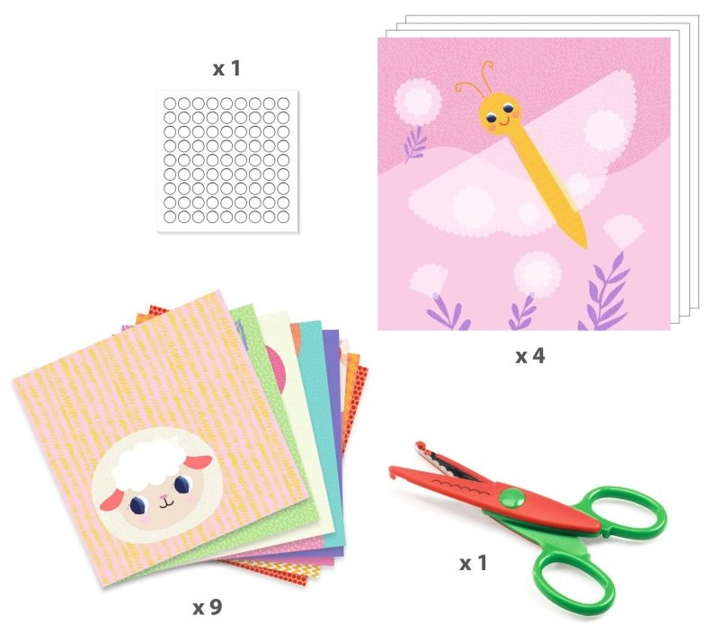 Zestaw artystyczny dla najmłodszych od Djeco, które lubią twórcze i kreatywne prace. Zawiera materiały potrzebne do uzupełnienia takie jak: łapki, skrzydła, ogonki. Dzieci mogą ciąć kartki za pomocą nożyczek, które następnie przyklejają i przygotowują kolaże ze zwierzątkami, które mogą okazać się fantastyczną ozdobą do pokoju dziecka.