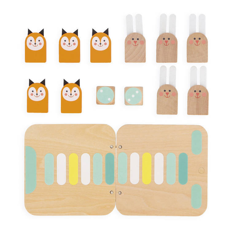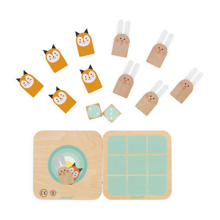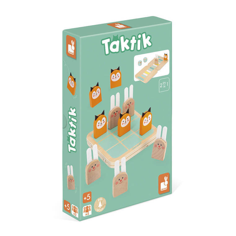 Zestaw dwóch gier strategicznych Kółko i krzyżyk Wyścig Taktik to kolejna propozycji drewnianej gry od francuskiej marki JANOD. W grze mogą wziąć udział 2 osoby, w tym także dorośli. Podstawą dla gry jest składana, stworzona z drewniana plansza, która posiada pola do znanej wszystkim gry w kółko i krzyżyk. Z kolei po jej rozłożeniu uzyskamy tor wyścigu dla 5 drewnianych figurek-lisków oraz 5 figurek-zajączków. Każda w nich posiada filcowe uszka. Jak zacząć pierwszą grę? To proste! Wystarczy ustawić figurki na polach w taki sposób, by utworzyły linię, składającą się z trzech takich samych zwierzątek w poziomie, pionie lub po skosie. Zwycięzcą będzie ten gracz, który jako pierwszy dokona tej sztuki. Kolejny wariant gry to wyścig między zającem i lisem. Rzut kością, a właściwie wylosowana liczba oczek zadecyduje o tym, o ile pól do przodu dany gracz może się przemieścić. Kto pierwszy dotrze do mety ten wygrywa. Wśród niewątpliwych atutów gry należy wymienić m.in: "wymusza" myślenie strategiczne, wspomaga koncentrację i zaznajamia bądź utrwala umiejętność rozpoznawania kolorów, a także rozbudza wyobraźnię. To wyjątkowa rozrywka dla całej familii. Ta zaprojektowana we Francji gra, zapakowana została w estetyczne pudełko, dzięki czemu jest gotowa do wręczenia w ramach prezentu dla chłopca i dziewczynki.