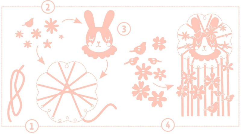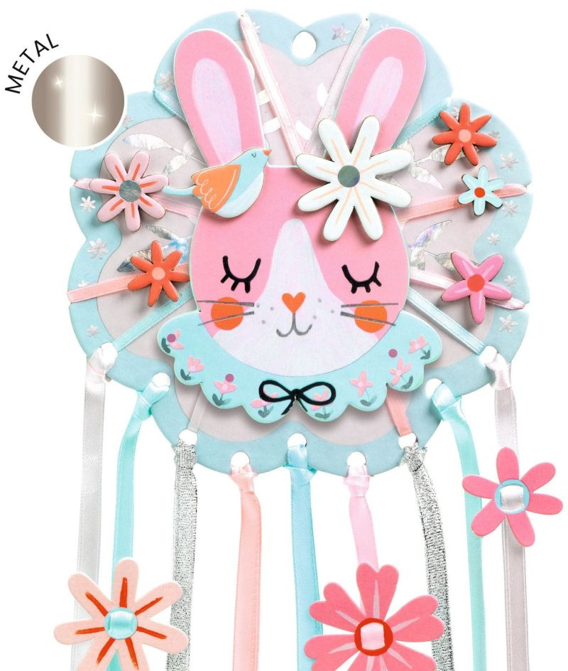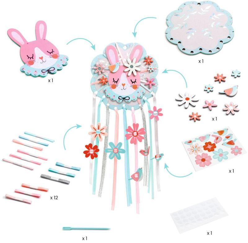 Głównym elementem łapacza snów od Djeco jest podobizna uroczego króliczka, którego należy ozdobić różnokolorowymi sznurkami, wstążeczkami i naklejkami. W komplecie przewidziano bogaty wybór akcesoriów w postaci: