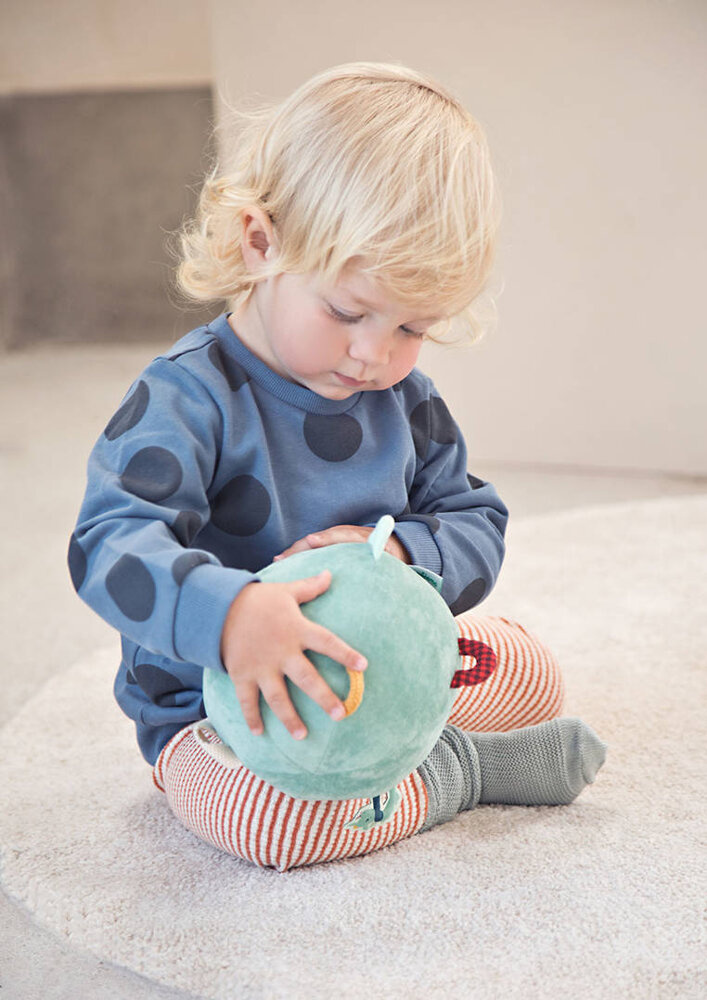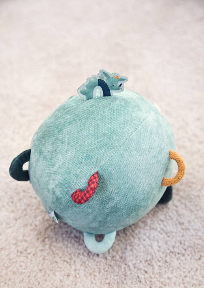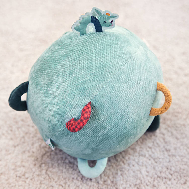 Miękka wielofunkcyjna dźwiękowa piłka sensoryczna Smok Joe belgijskiej marki Lilliputiens to doskonałe źródło rozrywki i nauki dla maluszków otwartych na świat. Piłka jest wykonana z zielonej strukturalnej tkaniny, posiada mnóstwo stymulujących sensorycznie kolorowych małych uchwytów oraz metkę ze Smokiem Joe, natomiast wewnątrz piłki ukryta jest pozytywka emitująca 7 różnych dźwięków, m.in. trąbki czy marakasów. Jest poręczna i w 100% bezpieczna. Maluszek będzie z nią wykonywać czynności jak: chwytanie, potrząsanie, turlanie czy rzucanie, co jest naturalnym etapem jego rozwoju. Tego rodzaju aktywności wpływają na rozwój małej motoryki. aktywizuje zmysł dotyku i słuchu (gra). Ta miękka piłka do zabawy jest solidnie wykonana i w 100% bezpieczna. Interesujący design i kolorystyka aktywizują również wzrok dziecka. To doskonały pomysł na prezent zarówno dla chłopca jak i dla dziewczynki od 6 miesiąca życia.