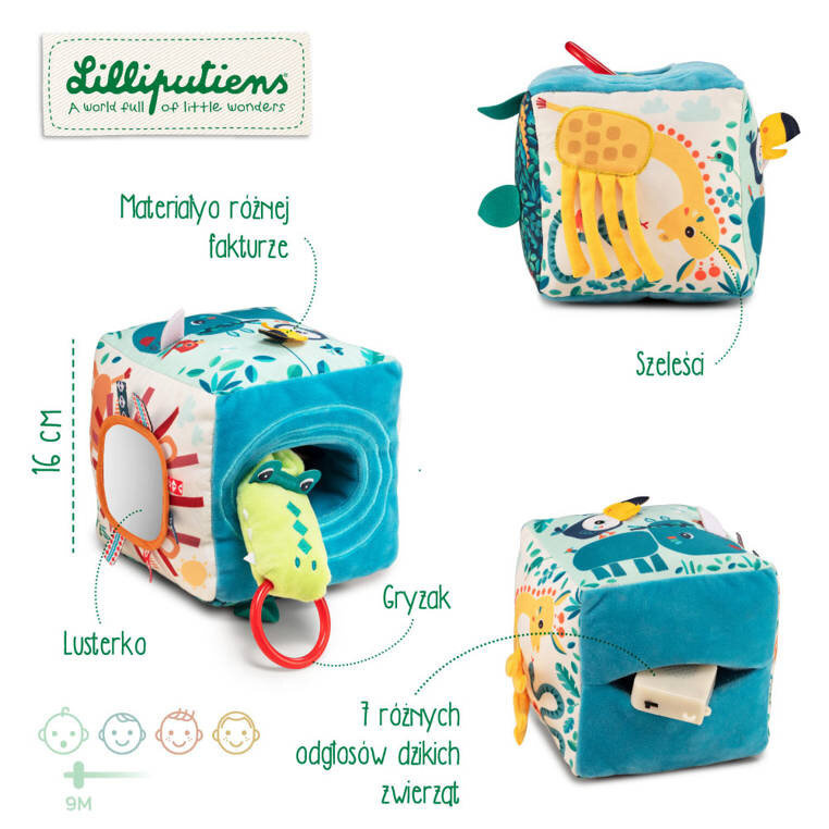 Miękka wielofunkcyjna dźwiękowa kostka aktywizująca Dżungla belgijskiej marki Lilliputiens to doskonałe źródło rozrywki i nauki dla maluszków otwartych na świat. Na niemal każdym z boków znajduje się charakterystyczny dla marki bohater z tropików: żyrafa Zia posiadająca długie nogi pełniące funkcję wypustek sensorycznych, Lew Jack z miękkim lusterkiem w miejscu głowy, Nosorożec Marius z odstającym rogiem wykonanym z filcu, Tukan Pablo z dziobem, za którego można złapać, zarośla z liśćmi ze strukturalnej tkaniny, jak również ukryty wewnątrz kostki Krokodyl o imieniu Anatol – można go wydobyć chwytając za gryzak (pod postacią kołka), który trzyma w pysku. Kostka została uszyta z materiałów o różnych wzorach i fakturach, co podkreśla olbrzymią wartość zabawki pod kątem rozwoju sensorycznego. Jedną z głównym atrakcji zabawki jest umieszczona wewnątrz i uruchamiana za pośrednictwem przycisku pozytywka z odgłosami 7 dzikich zwierząt: lwa i papugi, tukana, krokodyla, małpy, węża i słonia. Dzięki zabawce maluch prędko nauczy się je rozpoznawać, a jego zmysł słuchu będzie przy tym aktywizowany. Ta miękka kostka do zabawy jest solidnie wykonana i w 100% bezpieczna. Pobudza dziecięcą wyobraźnię, zachęca do snucia opowieści, odgrywania ról i odtwarzania sytuacji, znanych z życia. Zabawka zachęca najmłodszych do wykonywania wielu czynności jak: zamykanie otwieranie, chwytanie, przesuwanie co bez wątpienia pomoże rozwijać małą motorykę. Interesujący design i kolorystyka aktywizują również wzrok dziecka, a obręcz-gryzak – przynosi ulgę w trudnym okresie ząbkowania. To doskonały pomysł na prezent zarówno dla chłopca jak i dla dziewczynki od 9 miesiąca życia.