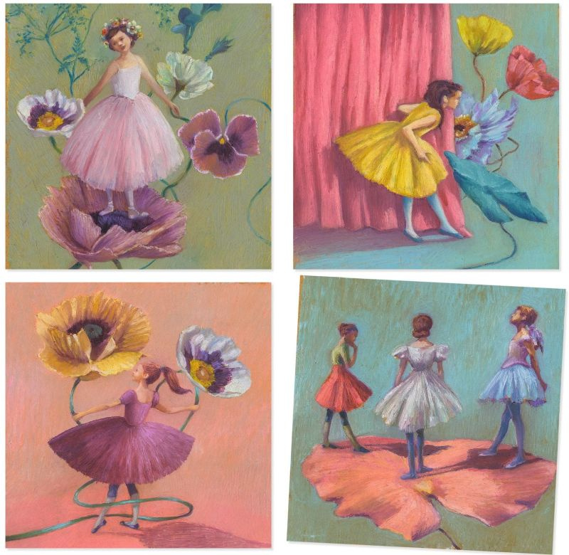 W środku znajduje się 8 kart ilustrowanych o wymiarach 20 x 20 cm (4 wzory po dwie sztuki). Mały artysta koloruje stopniowo obrazki, dodając refleksy światła oraz cienie na baletnicach i ich tutu. Francuski szyk ukryty między warstwami tiulowych paczek romantycznych łączy się estetycznie z dopełnieniem w postaci motywów sceny oraz kwiatowych kompozycji w tle.