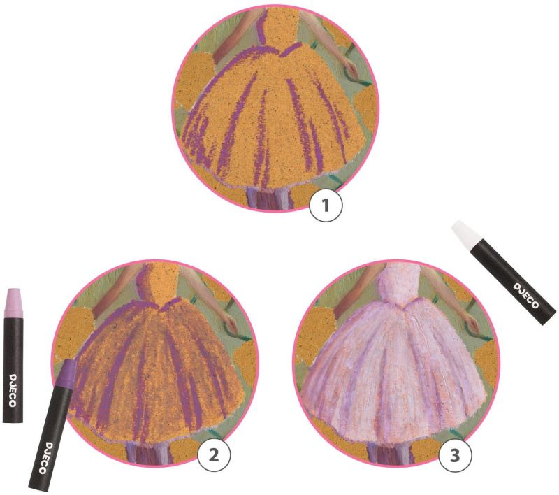 To jednak nie koniec niespodzianek! "Inspiracje" zestaw artystyczny Baletnica Djeco zawiera również aż 12 pasteli olejowych w różnych kolorach. Dzięki nim od razu po rozpakowaniu zestawy można przystąpić do pracy i pięknie oddać niuanse światłocieni, które wkrótce pojawią się na ilustracjach...