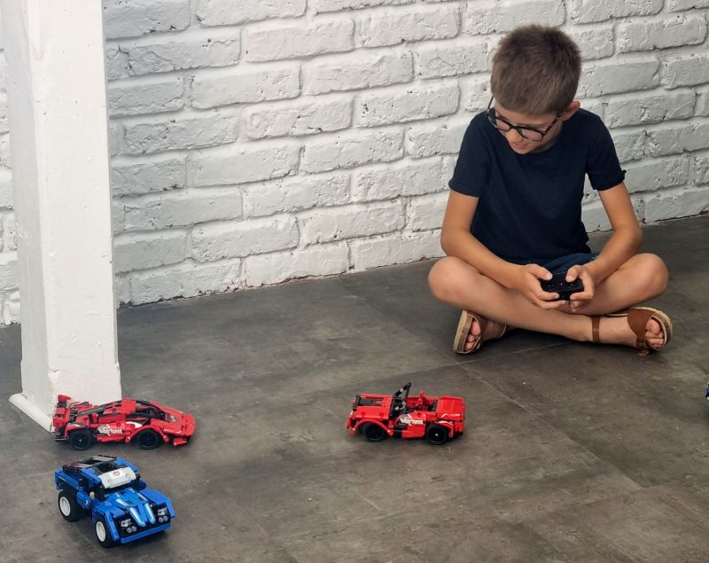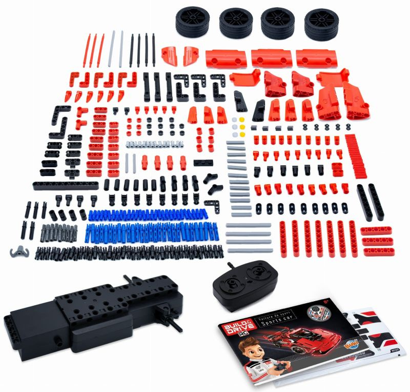 Gotowy pojazd prowadzi się zdalnie dzięki pilotowi dołączonemu do zestawu.
