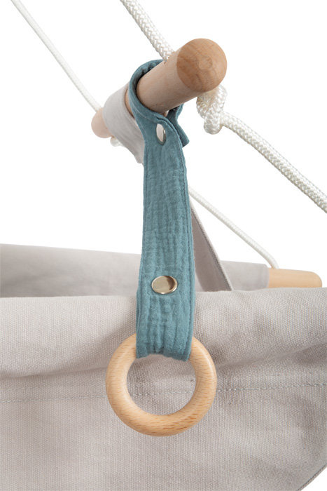 Huśtawka dla dzieci Small foot zakończona jest metalowymi pierścieniami, które można szybko i bezproblemowo zawiesić lub stworzyć własną konstrukcję z karabińczykami.