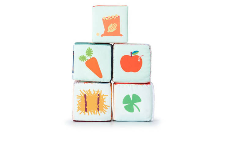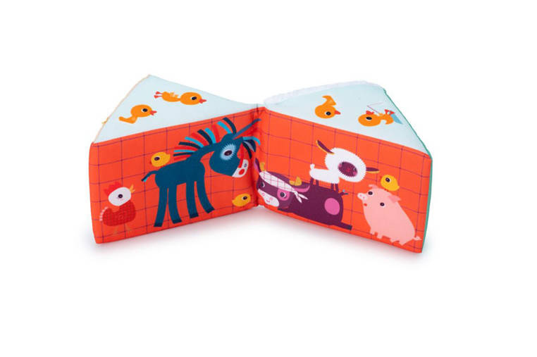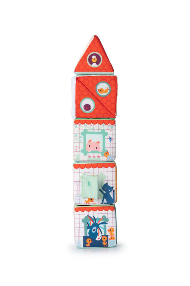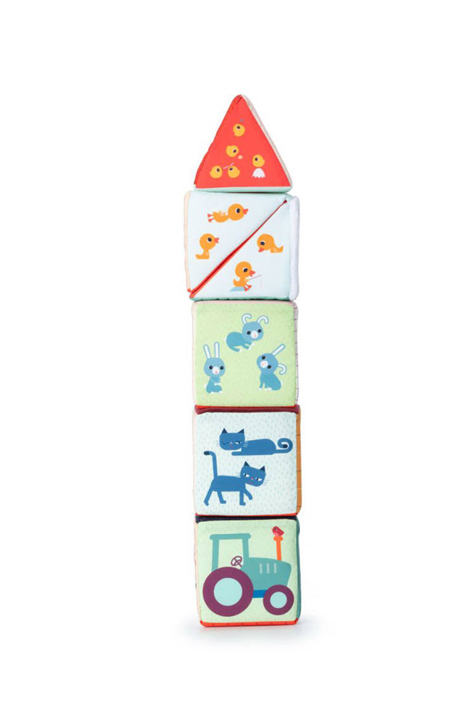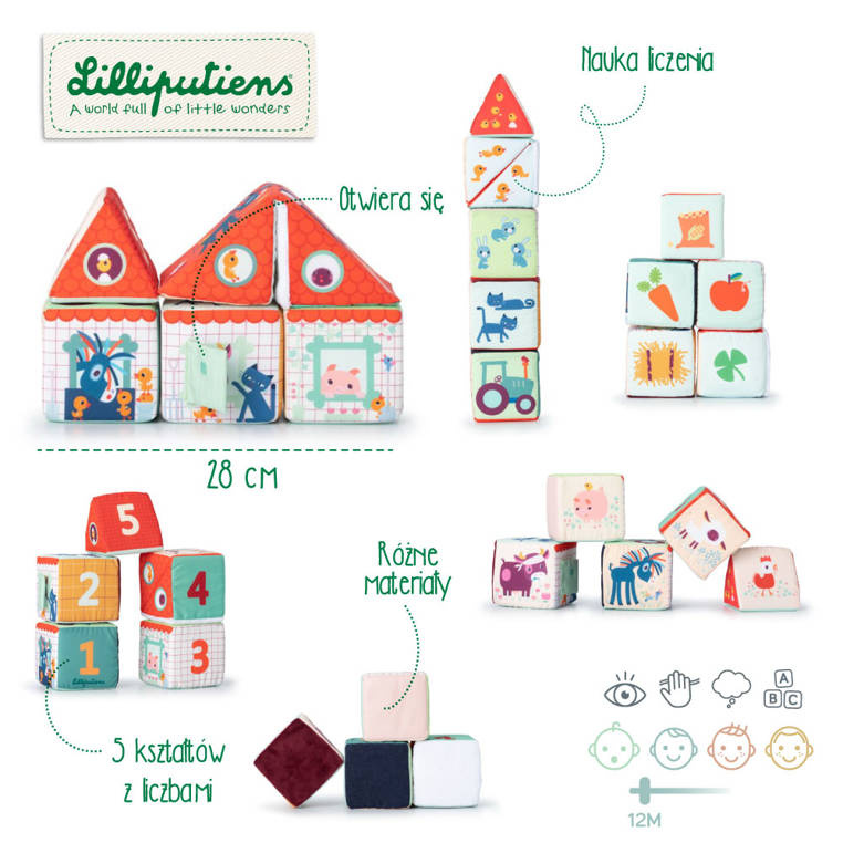 Maluszek, którego pragniesz obdarować prezentem właśnie kończy 1 rok życia i poszukujesz wsparcia dla jego rozwoju? Mamy dla Ciebie wspaniałą wiadomość, gdyż nie musisz szukać dalej! Ten wyjątkowy, składający się z 5 elementów zestaw multifunkcyjnych klocków "Stodoła Farma" belgijskiej marki Lilliputiens to idealna zabawka dla otwartego na rozwój maluszka. Do granic możliwości pobudza dziecięcą wyobraźnię. Ilustracje każdego z klocków różnią się od siebie, a niektóre z nich posiadają także ukryte elementy oraz funkcje. Cztery z nich posiadają kształt sześcianów, z których jeden można rozkładać na pół po przekątnej. Ostatni element przybrał formę graniastosłupa o trójkątnych bokach. Maluch, z powierzonych mu elementów będzie wstanie stworzyć stodołę z charakterystycznym, czerwonym dachem, oraz z otwieranymi oknami i drzwiami. Na kolejnych ściankach projektant zabawki umieścił wizerunki postaci zwierząt gospodarskich: krówki Rosalie, osiołka Ignace'a, owieczki Yvonne, kokoszki Paulette, świnki Simona. Kolejne boki obszyto tkaninami o różnych fakturach, dzięki czemu wykazują one dużą przydatność w kwestii ćwiczeń sensorycznych. Kolejne boki klocków zawierają cyfry od 1 do 5, a jeszcze następne – elementy w odpowiedniej liczbie, tj. 1 traktor, 2 koty, 3 zajączki, 4 kaczątka i 5 kurczaczków. I wreszcie ostatnie już boki przedstawiają ilustracje plonów: marchew, koniczynę, jabłko, kukurydzę czy siano. Za pośrednictwem wykonywania czynności jak: otwieranie, zamykanie, chwytanie, ustawianie jeden na drugim, obracanie - dziecko rozwinie małą motorykę. Z kolei różnorodne kolory poszczególnych elementów zestawu aktywizują zmysł wzroku malucha. Za rozwój zmysłu dotyku odpowiadają materiały o zróżnicowanej fakturze, jak również wystające detale. Ten zestaw miękkich klocków to także doskonałe wprowadzenie do rozpoznawania cyfr i nauki liczenia. Ten pobudzający dziecięcą wyobraźnię zestaw klocków, zachęca do snucia opowieści, odgrywania ról i odtwarzania sytuacji, znanych z życia na wsi. Z racji wysokiej wartości edukacyjnej, jak również przez wzgląd na uniwersalną tematykę i neutralną kolorystykę, ten zestaw wielofunkcyjnych, miękkich kloców będzie wyjątkowym prezentem zarówno dla chłopców jak i dla dziewczynek od 1 roku życia.