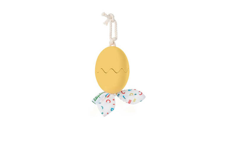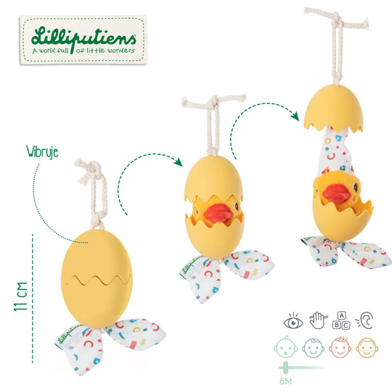 Rozwojowa multifunkcyjna zawieszka jajko z funkcją wibracji Kaczorek Gaspard Lilliputiens belgijskiej marki Lilliputiens to fenomenalne źródło niekończącej się rozrywki dla niemowlaków i nieco starszych dzieci. Ta oryginalny zawieszka przybrała postać intensywnie żółtego jajeczka, w którym ukrywa się Gaspard. To wyjątkowa forma zawieszki, gdyż szczególnie mocno wspiera rozwój motoryczny dziecka. Ten niezastąpiony atrybut każdego rozwijającego się malucha występuje tu pod postacią intensywnie żółtego jajeczka, w którym ukrywa się Gaspard. Aby wydobyć z zabawki "efekt specjalny" wystarczy złapać za białą, tkaninową kokardkę w kolorowe wzory geometryczne, rozciągnąć jego długie ciało, a następnie oczom dziecka ukaże się prawdziwy spektakl, w którym główną gwiazdą będzie wibrujący kaczorek. Są to elementy stymulujące malucha pod kątem sensorycznym, aktywizujące zmysł wzroku i dotyku, ale także ćwiczące zręczność i chwyt. Z pewnością wyżej opisane "efekty specjalne" będą dla najmłodszych zaskakujące, przez co pobudzą jego wyobraźnię. Poprzez wykonywanie czynności jak: chwytanie i rozciąganie, dzieci rozwijają małą motorykę. Zabawka jest także pewnego rodzaju wstępem do poznania związków przyczyno-skutkowych. Ta stworzona z najwyższej jakości materiałów przytulanka jest uniwersalna tematycznie i kolorystycznie, stąd też może ona stanowić interesujący podarunek zarówno dla chłopca jak i dla dziewczynki od 6 miesiąca życia.