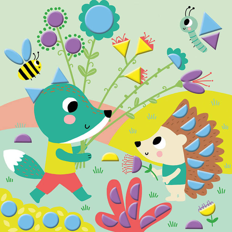 Zestaw kreatywny francuskiej marki Janod składający się z naklejek geometrycznych oraz 4 obrazkowych plansz. Zestaw przedstawia różne zwierzątka w nietypowych sytuacjach: spotkanie lisa i jeża na łące, świnkę podczas zbiorów w sadzie, cyrkowe popisy lwa i krokodyla oraz urodzinowego dinozaura z balonikami. Ilustracje te można dodatkowo ozdobić, używając do tego celu kolorowych, piankowych naklejek o geometrycznych kształtach – trójkąty i kwadraty, koła i półkola. Zestaw zawiera 5 arkuszy takich drobnych aplikacji. Projektant tego kreatywnego zestawu wykazał się także sporym sprytem, tworząc opakowanie w ten sposób aby stanowiło jednocześnie wyjątkowa ramkę 3D dla powstałego działa. Naklejanie to dla dziecka długie godziny angażującej i jednocześnie uspokajającej, wyciszającej zabawy, a gotowe obrazki staną się wspaniałym elementem dekoracyjnym dziecięcego pokoju. Zestaw zaprojektowano we Francji. Idealnie nadaje się na prezent.