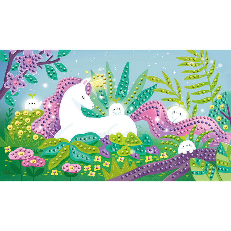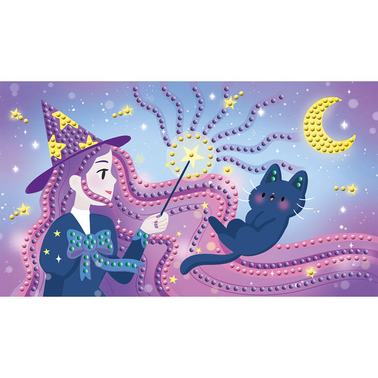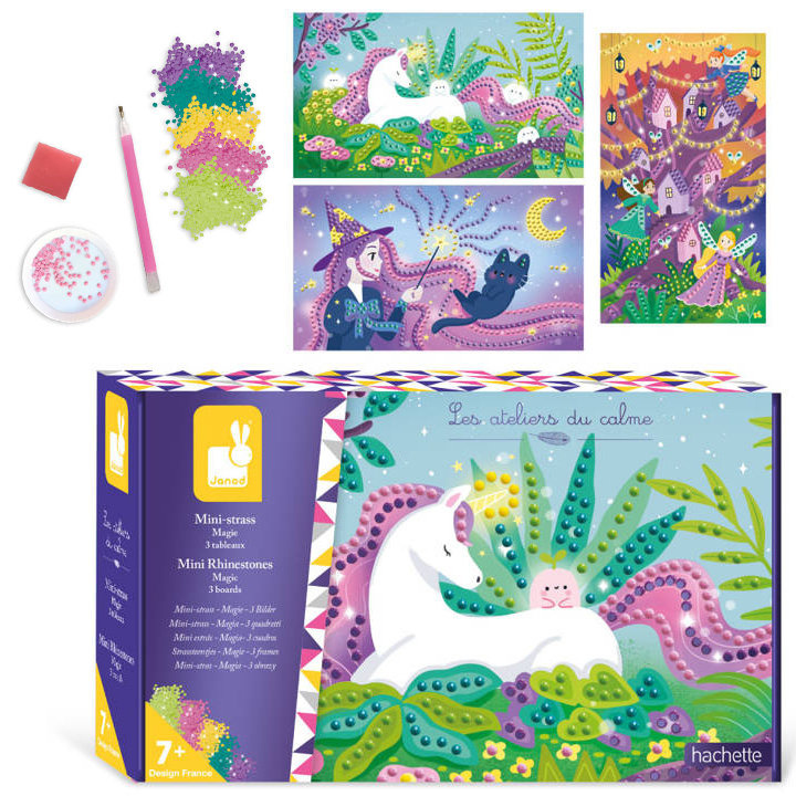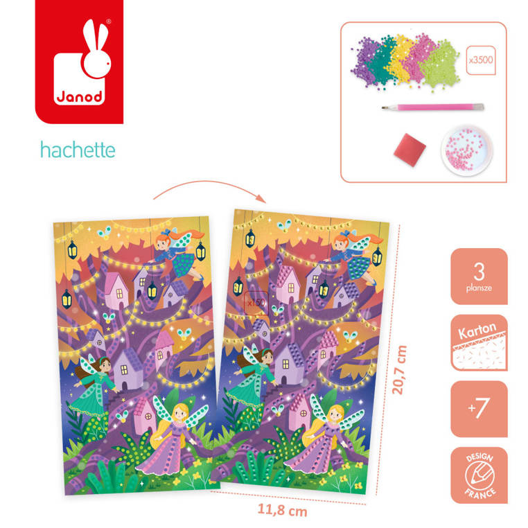 Zestaw kreatywny "Diamenciki Magia" francuskiej marki JANOD składa się z 3 niesamowitych obrazkowych plansz w następujących tematach: jednorożec na polanie, czarodziejka z kotem i drzewo z domkami leśnych wróżek. Do zestawu dołączono nieznacznej wielkości kolorowe diamenciki w liczbie 1350 sztuk, a także spodeczek, wosk w kostce oraz narzędzie do nabierania ozdóbek. Szybko przekonasz się, że obdarowany maluch będzie zachwycony możliwością kreatywnego wykorzystania naklejek. Będzie korzystał z nich bardzo długo i w słusznym celu, bowiem rozwinie się przy tym na wielu płaszczyznach. Po zakończonej zabawie, jego wspaniałe dzieło posłuży jako ozdoba dla wnętrza dziecięcego pokoju. Wieloletnie doświadczenie mówi nam jasno, że ten zestaw artystyczny będzie trafionym i optymalnie wykorzystanym artykułem, podarowanym 7 lub 8 latkowi w formie prezentu.