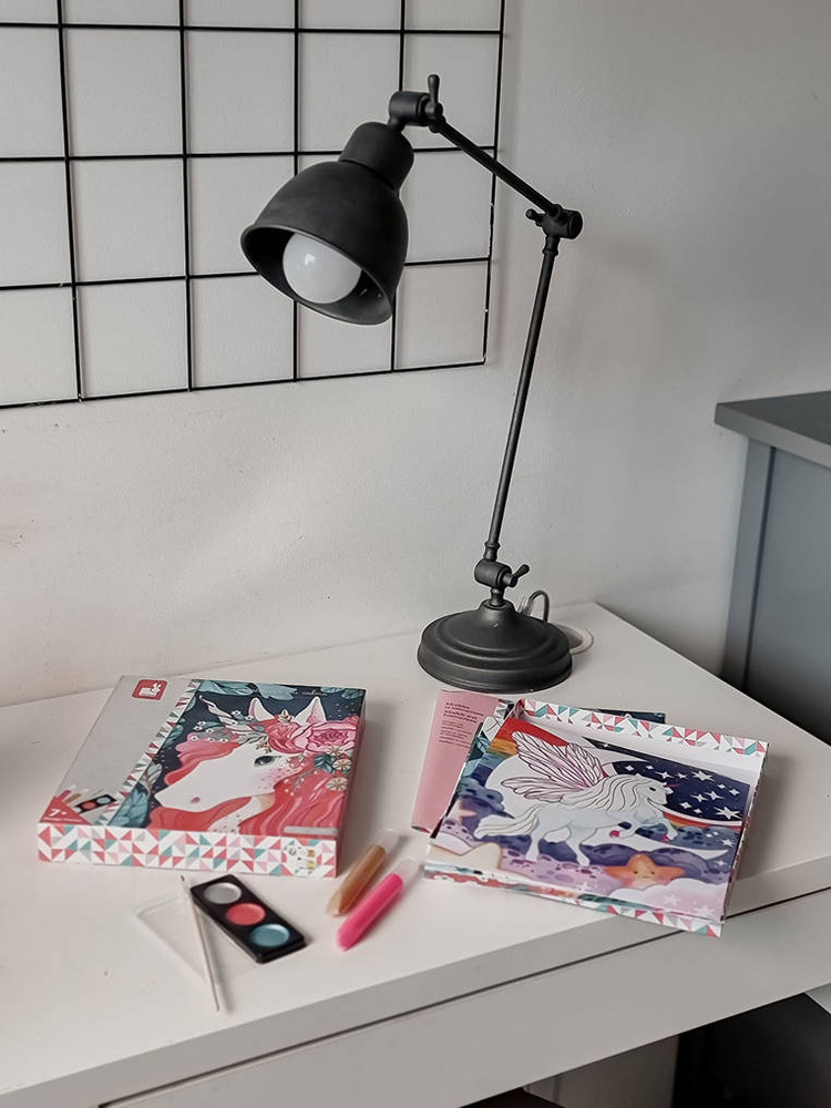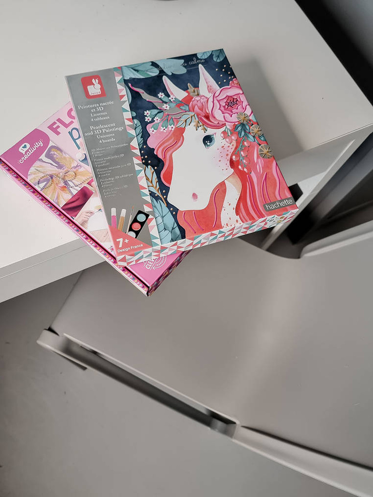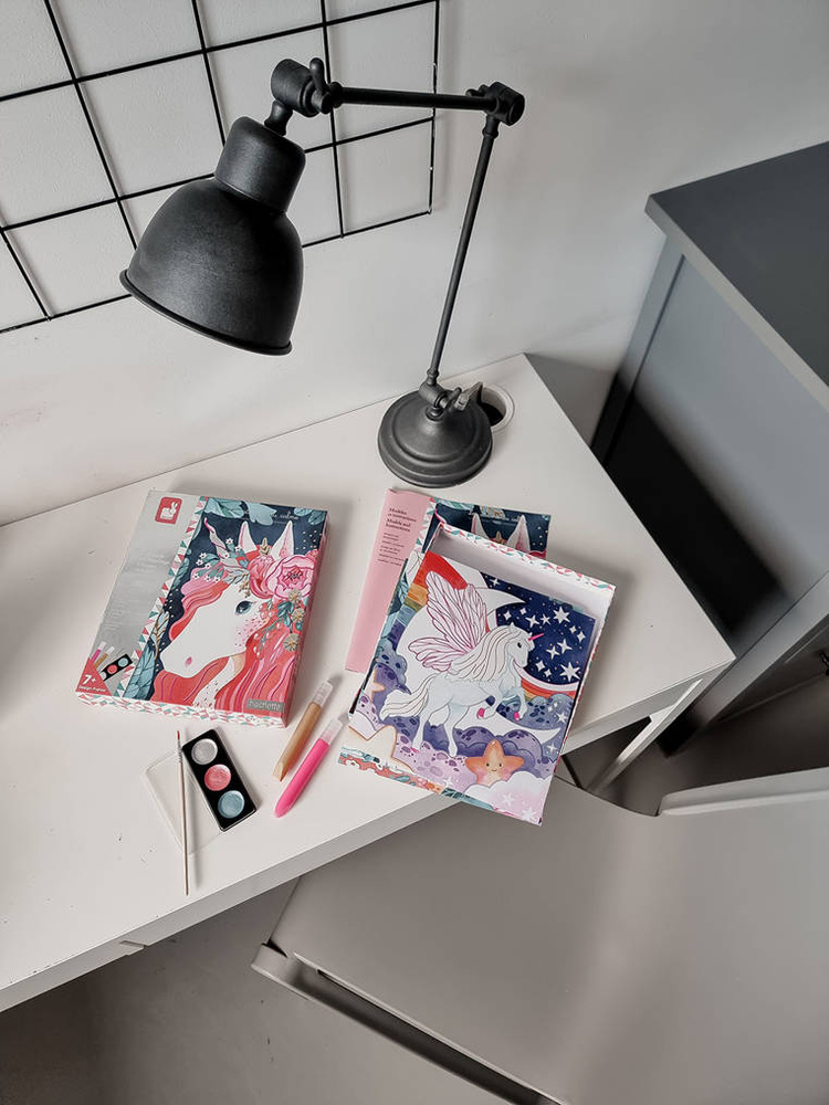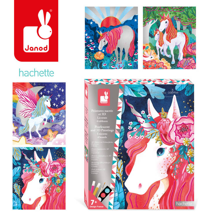Zestaw kreatywny malowanie farbami perłowymi i 3D Jednorożce to propozycja od francuskiej marki JANOD. Składa się 4 obrazkowych planszy z barwnymi baśniowymi sceneriami, których bohaterami są wyjątkowo urokliwe jednorożce. Dołączone do zestawu farby perłowe posłużą do ozdobienia ilustracji, do dyspozycji są 3 kolory farb nadających satynowy połysk oraz dwa kolory farb do malowania 3D. Farby – fuksjowa i złota – znajdują się w tubkach ze specjalnymi końcówkami, umożliwiającymi ich precyzyjne nakładanie. Z kolei farby perłowe nakładane są przy użyciu załączonego do zestawu specjalnego pędzelka. Nie obawiaj się, że zadanie będzie za trudne, bowiem pierwsze kroki stawiać będziesz posiłkując się dołączona do zestawu instrukcją. Dzięki wykorzystaniu różnych technik malowania, dziecko spędzi przy tym zestawie sporo czasu, jednocześnie podczas pracy będzie przyjemnie wyciszone. Ten wyjątkowy zestaw zaprojektowano we Francji we współpracy z tamtejszą grupą mediową i wydawniczą Hachette. Projektant zestawu wykazał się sporym sprytem, dzięki czemu kartonowe opakowanie produktu można wykorzystać jako wspaniałą ramkę 3D dla swojego dzieła. Produkt ten idealnie nadaje się na prezent dla każdego małego artysty w wieku 7 lat lub starszego.