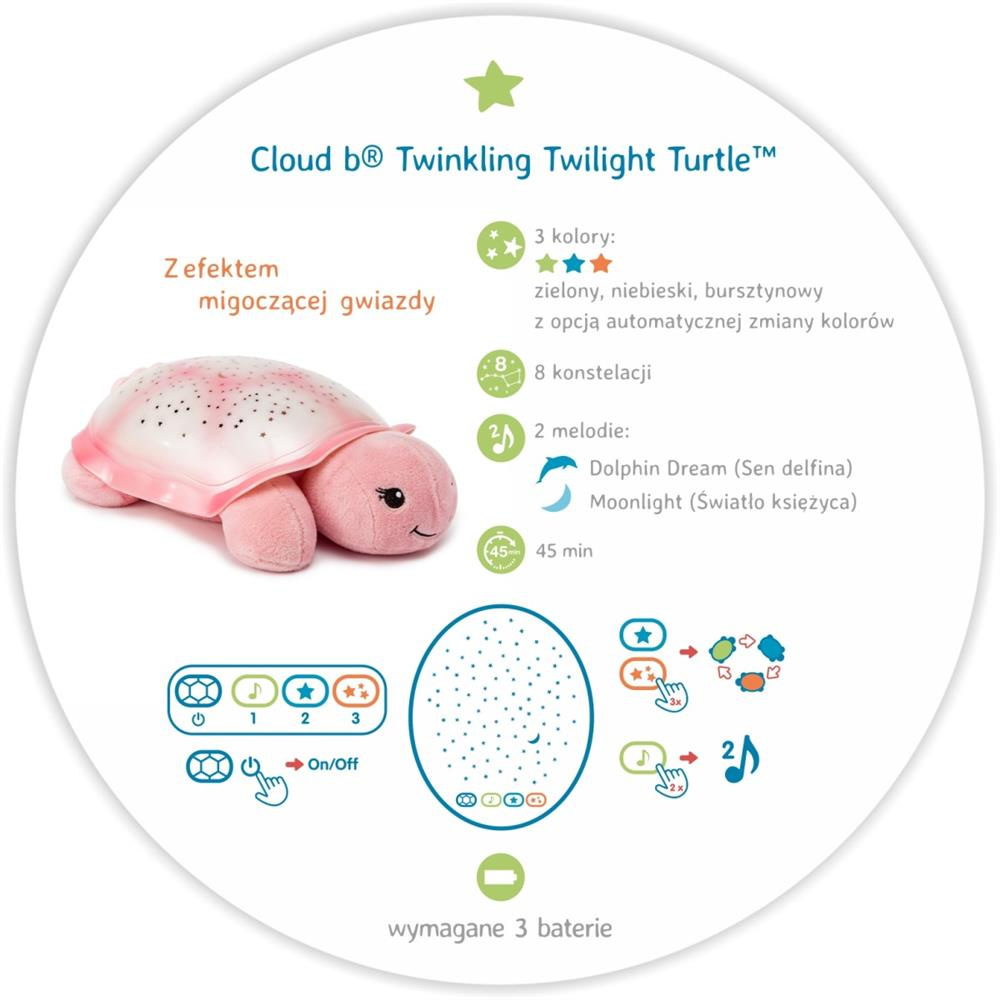 Twinkling Twilight Turtle to także relaksujące melodie – „Dolphin Dreams” i „Clair De Lune” – które umilają czas przed snem. Regulowany poziom głośności oraz timer wyłączający lampkę po 45 minutach sprawiają, że produkt jest idealnym rozwiązaniem do wyciszenia dziecka przed snem. Przewodnik po gwiazdach, dołączony do zestawu, pomaga rodzicom opowiadać o gwiazdach, wzbogacając wieczorne rytuały.