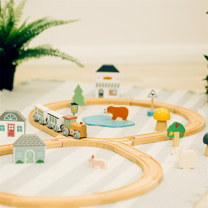 Ten zestaw kolejki dla dzieci marki Bigjigs Rail składa się z 17 elementowego torowiska w kształcie ósemki, pociągu i innych elementów. Z tym wykonanym z certyfikowanego (FSC) drewna zestawem, obdarowany maluch odkryje także prawdziwe cuda lasu. Od teraz mali miłośnicy pociągów zasuwać będą po torach, mijając przy tym muchomory, sosny i pełne uroku leśne zwierzątka. Ten wyjątkowy, zapierający dech w piersiach drewniany zestaw kolejkowy zawiera bardzo solidne, drewniane elementy torów, które po złożeniu tworzą układ ósemkowy, a także dodatki, takie jak piekarnia, kawiarnia, ekologiczna lokomotywa z dwoma wagonami, znaki drogowe, drzewa, muchomory, leśne zwierzęta oraz wiele innych. Kolejka może być używana indywidualnie, lub też w połączeniu z innymi zestawami, nawet innych marek. Zabawa kolejką oferuje dziecku szansę wzięcia udziału w niesamowitej przygodzie. Budowa linii kolejowych otwiera umysł dzieci, stymulując ich wyobraźnię. Dziecko, układając tory, znaki i drogi, a na samym końcu przybierając rolę maszynisty, pracuje nad motoryką, orientacją przestrzenną oraz koordynacją ruchową. Preferowany wiek użytkownika kolejki to od 3 lat.