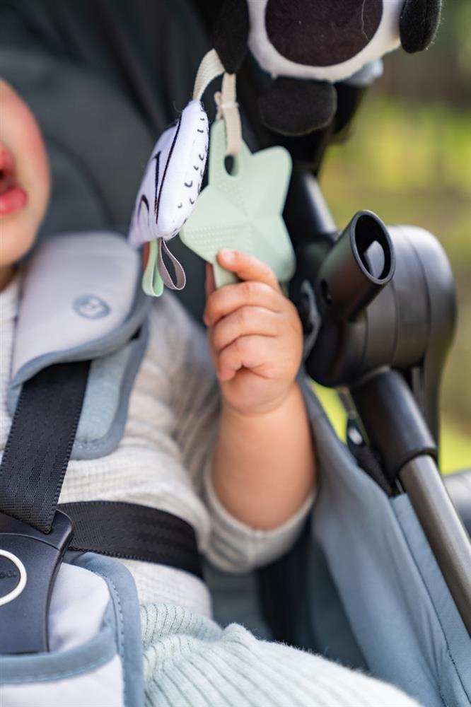 - Uniwersalny pierścień mocujący – umożliwia łatwe przypięcie do wózka, fotelika, gondoli, łóżeczka czy maty.