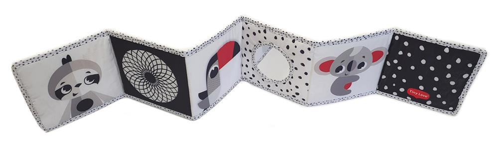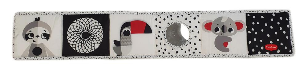 Dwustronna książeczka interaktywna Boho Chic marki Tiny Love to zabawka edukacyjna wspierająca rozwój sensoryczny i motoryczny dziecka od pierwszych dni życia. Z jednej strony oferuje kontrastujące czarno-białe wzory z akcentem czerwieni, które są doskonale dopasowane do percepcji wzrokowej noworodków, a z drugiej – kolorowe ilustracje i aktywizujące elementy, stymulujące starsze niemowlęta.