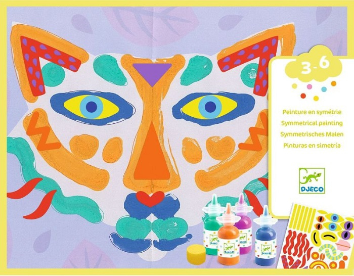 W komplecie do tworzenia odbitek od Djeco znajdują się 4 arkusze do malowania – gdy już zabezpieczenie miejsce pracy obrusem ochronnym, nałóżcie farby gwasz na jedną ze stron składanego szablonu. Następnie kartkę należy złożyć na pół i dokładnie przycisnąć. Po rozłożeniu szablonu ukaże Wam się niezwykła podobizna zwierzaka.