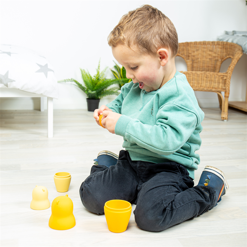 Zestaw zabawek edukacyjnych dla rocznego dziecka "Niedźwiedzie w gnieździe" marki Bigjigs Toys to rewelacyjny pomysł na urozmaicenie czasu spędzonego w domowym zaciszu. Jeżeli układasz dla swojego maluszka przestrzeń do życia, która będzie całkowicie wolna od plastików to ten zestaw będzie pasował idealnie. Niedźwiadki będę odgrywały rolę edukacyjnej zabawki rozwojowej, stanowią także pełną uroku dekorację pokoju niemowlaka. Są wyjątkowo miękkie i elastyczne, więc ząbkujące maluchy mogą je gryźć, co z pewnością przyniesie im ulgę. Są jednocześnie bardzo wytrzymałe i odporne na wszelkie uderzenia i zadrapania. Niedźwiadki są wykonane w 100% z silikonu spożywczego. Silikonowe zabawki są bardziej ekologiczne niż plastikowe i higieniczne, bez otwartych porów, które mogłyby być siedliskiem bakterii. To rewelacyjne rozwiązanie zapewni maluszkowi ciekawą rozrywkę w czasie pobytu w pokoju lub może bawić się nimi także w plenerze. Są stosunkowo niewielkie, a co za tym idzie można je zabrać sobą praktycznie wszędzie. Te ekologiczne zabawki powstały przy wykorzystaniu silikonu spożywczego, który wykazuje odporność na temperaturę i zabrudzenia. Produkt przeznaczony jest dla dzieci od 12 miesiąca życia.
