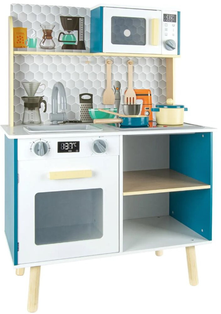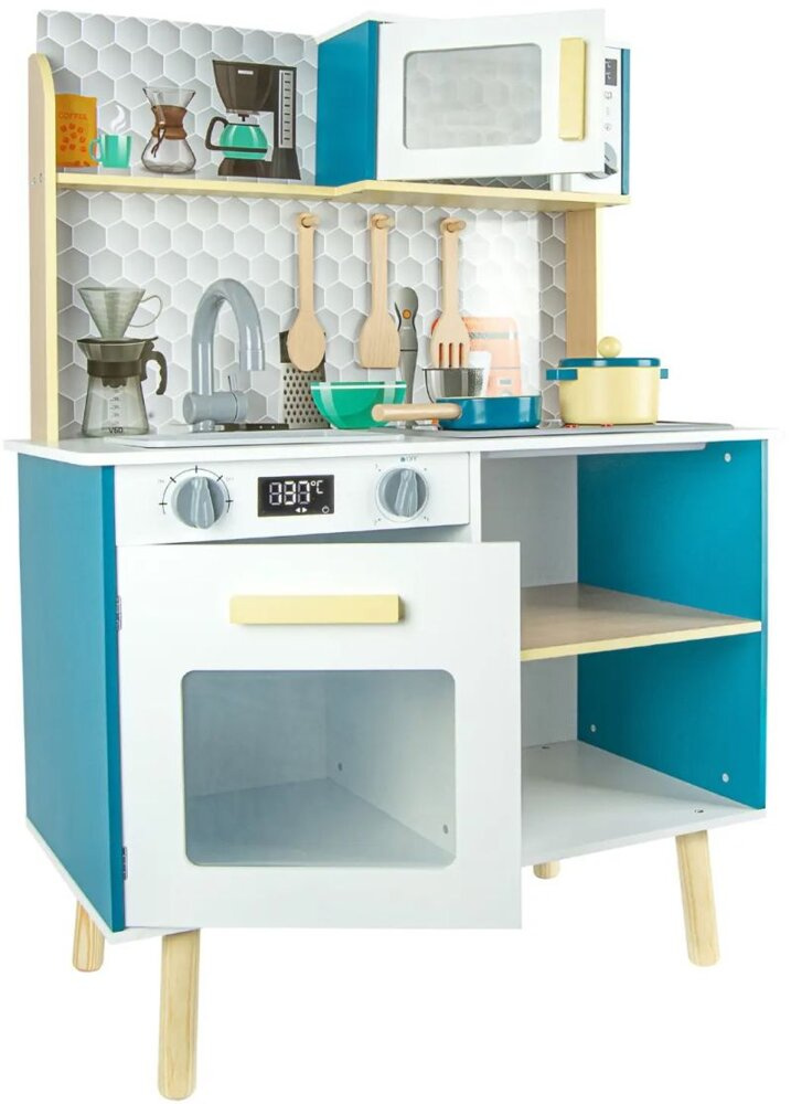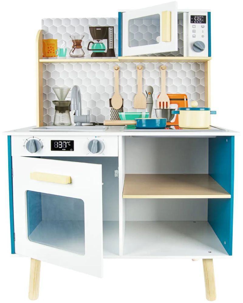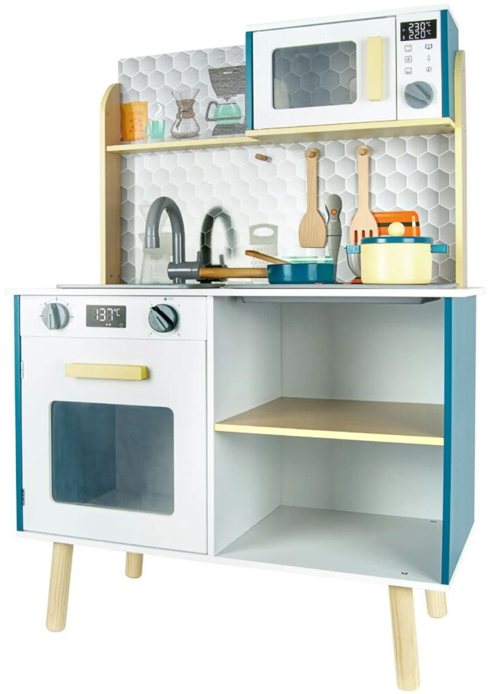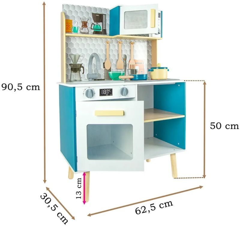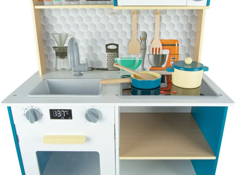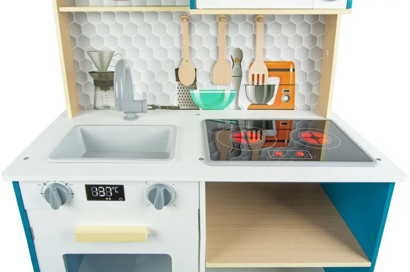 Ta zabawkowa kuchnia z efektami dźwiękowymi i świetlnymi stworzona została z porządnej płyty z drewna o grubości aż 9 mm! Klasyczne piękno drewna podkreśla biel oraz przyciągający spojrzenia turkus. Charakteru zaś zabawkowej kuchni dodają pastelowe wykończenia w żółci oraz zachowane w odcieniu naturalnego drewna półka i nóżki.