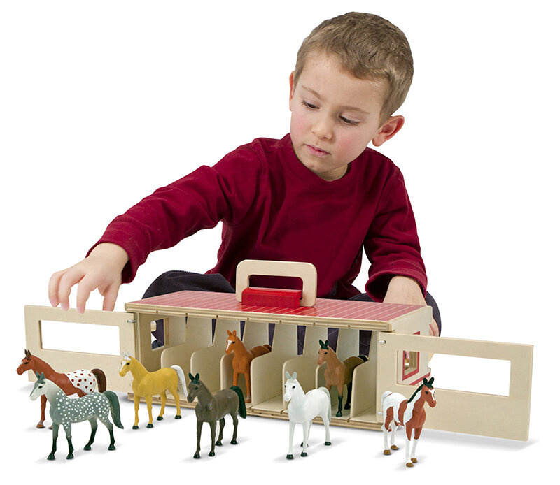 - Przenośna drewniana Stajnia otwiera się szeroko dla łatwego dostępu do zabawy i zamyka, aby zabrać ją ze sobą.