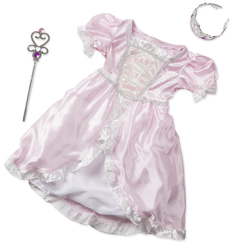 Zestaw Kostium Księżniczki z akcesoriami Melissa and Doug to rewelacyjna propozycja dla każdej małej damy. Ten składający się z 3 elementów komplet ma do zaproponowania różową suknię, tiarę i różdżkę. Dzięki temu zestawowi maluchy mogą wyobrażać sobie najróżniejsze przygody w zaczarowanym świecie, tym samym będą miały okazję do wykazania się kreatywnością. Twoja mała księżniczka przyodzieje piękną, różową stworzoną z satyny suknię z falbanami i królewskimi detalami. Ten olśniewający zestaw zawiera także srebrzystą koronę i różdżkę - obie z udawanymi klejnotami - które uzupełniają królewski strój. Do stworzenia stroju księżniczki użyto materiałów najwyższej jakości, dzięki czemu kostium prezentuje się elegancko i jest bardzo trwały. Taki strój to gwarancja wielogodzinnej zabawy na najwyższym poziomie. Kostium ten wyróżnia się pod względem komfortu noszenia, a zawdzięczamy ten fakt olbrzymiemu wkładowi zapalonych rodziców, którzy mocno się napracowali testując suknię pod każdym kątem i na wszystkich etapach powstawania produktu. Jako rodzic nie musisz obawiać się zabrudzenia sukienki czy atrybutów uzupełniających, gdyż suknię można prać w pralce a koronę i różdżkę bardzo łatwo wyczyścić do czysta. Ten zestaw kostiumów to świetny dodatek do koszyka z ubraniami do przebierania dla dziewczynek i chłopców. To idealny prezent dla każdego dziecka w wieku od 3 do 6 lat.