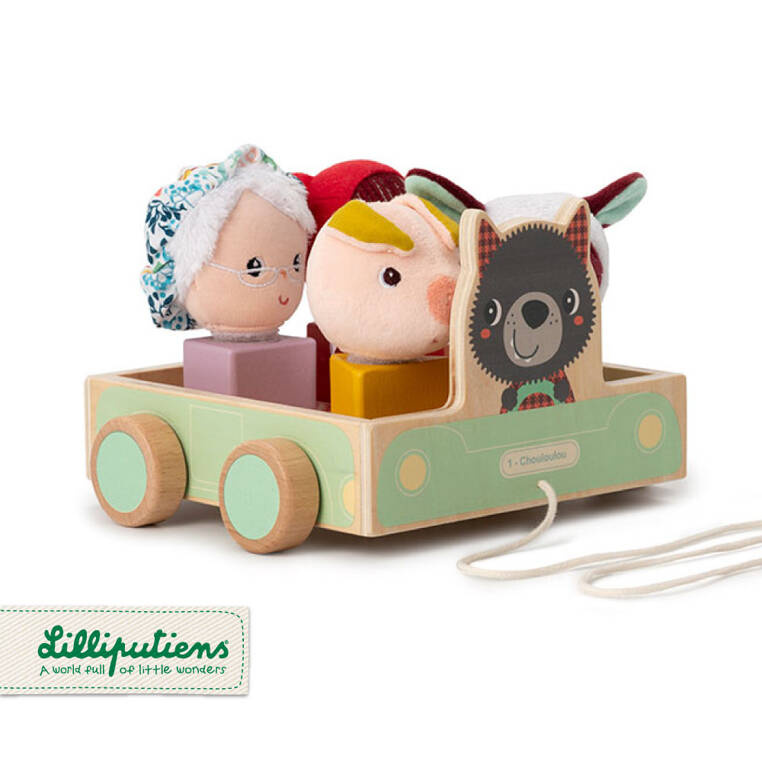 Jeżeli poszukujesz dla dziecka zabawki, która będzie dla niego istotnym wsparciem w rozwoju ruchowym to ten drewniany wózek z sorterem z kolekcji Wilk Louis belgijskiej marki Lilliputiens sprawdzi się do tego celu doskonale. Ten niezwykle przykuwający wzrok pojazd "kierowany jest" przez wilka o imieniu Louis. Na podkładzie pojazdu znajdują się także następujące postacie z bajek: Czerwony Kapturek, babcia, świnka i owieczka. Te postacie występują tutaj w formie drewnianych klocków z przyczepianymi na rzep tkaninowymi głowami. Dla urozmaicenia zabawy i tym samym zwiększenia możliwości rozwojowych tej zabawki, podstawy tych bohaterów bajek mają różne kształty geometryczne (kwadrat, trójkąt, trapez, koło), które należy dopasować w określone otwory we wkładce do wózka. Maluch będzie miał także za zadanie dopasować głowy do odpowiednich korpusów, kierując się przy tym względami kolorystycznymi. Należycie ułożone postacie zajmują swoje miejsca w wózku i mogą ruszać na wspólną wyprawę. Wózek został wyposażony w sznurek do ciągnięcia i stabilne, szeroko rozstawione drewniane kółka, które (co jest wyjątkowo istotne dla rodziców) nie porysują podłogi w domu. Zabawka jest solidnie wykonana, bezpieczna i zachwyca swoim niebanalnym designem. To subtelny a jednocześnie zdecydowany bodziec zachęcający dziecko do stawiania pierwszych samodzielnych kroków czy podejmowania innych śmiałych wyzwań sprawnościowych. Z racji uniwersalnej kolorystyki ten drewniany wózek z sorterem sprawdzi się idealnie jako prezent zarówno dla chłopca jak i dla dziewczynki. Rekomendowany wiek użytkownika zabawki to 12m+.