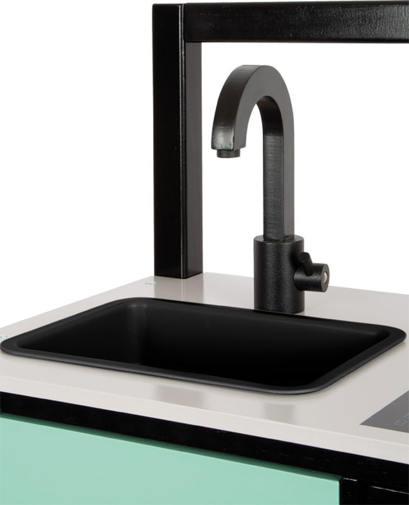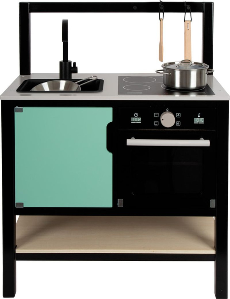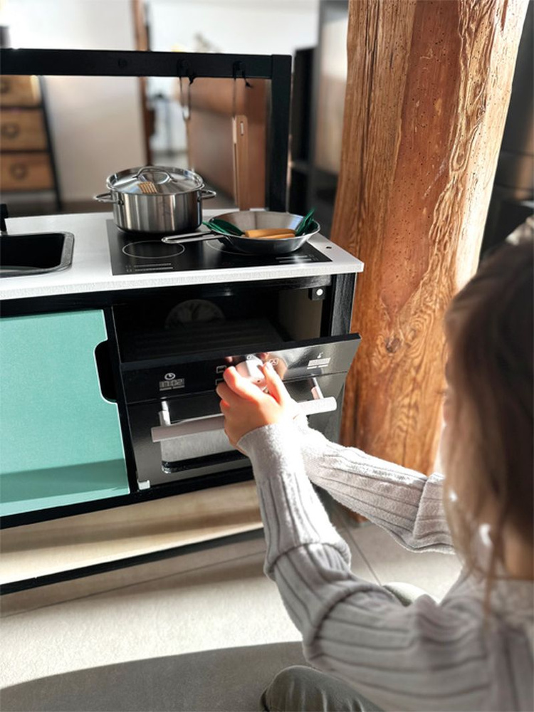 Nowoczesny, modułowy wygląd podkreślono czarną ramą – drewniana kuchnia do zabawy taka jak ta na pewno przyciągnie wszystkie spojrzenia!
