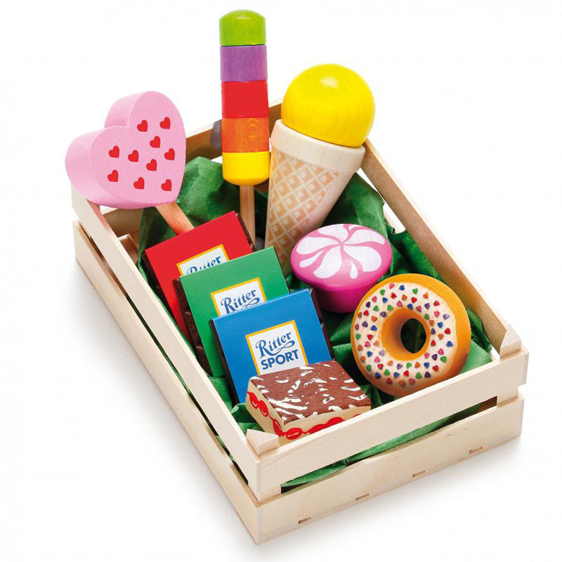 Słodkości do zabawy w sklep, lodziarnię, cukiernię czy kawiarnię to propozycja marki Erzi wykonana z wysokiej jakości drewna buku. Apetyczny wygląd zabawek to zasługa użycia bezpiecznych farb na bazie wody. W drewnianej skrzyneczce znajdują się 3 lody (jeden w rożku, jeden kolorowy na patyku i jeden na patyku w kształcie serca), 1 donut z polewą i posypką, 1 tartaletka, 1 kawałek ciasta Fale Dunaju (Danube-wavy cake) oraz zestaw 3 mini czekolad Ritter Sport w różnych smakach. Realistyczny wygląd słodyczy z pewnością zachęci każdego malca do zabawy w odgrywanie ról.