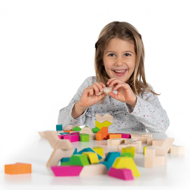 Zestaw drewnianych klocków GeoBlox niemieckiej marki Erzi zawiera 60 konstrukcyjnych klocków pomalowanych na kolorowo oraz naturalnie drewnianych. Pięć różnych kształtów klocków opiera się na trójkącie równobocznym, dzięki czemu można je układać w naturalny, intuicyjny dla dziecka sposób. Pozwala to na tworzenie unikalnych struktur. Wykonane z wysokiej jakości drewna buku, klocki są bezpieczne i trwałe, co sprawia, że są idealnym narzędziem do rozwijania umiejętności manualnych i logicznego myślenia u najmłodszych konstruktorów. GeoBlox MaxiMix to świetny sposób na tworzenie własnych światów i historyjek, jednocześnie rozwijając zdolności poznawcze i manualną sprawność maluchów.