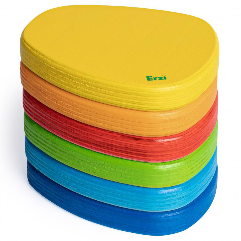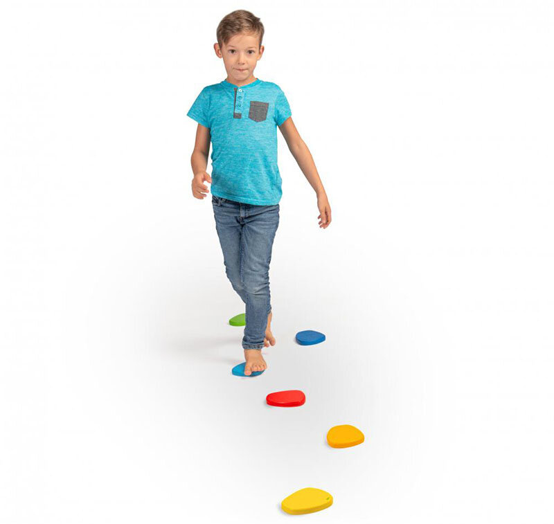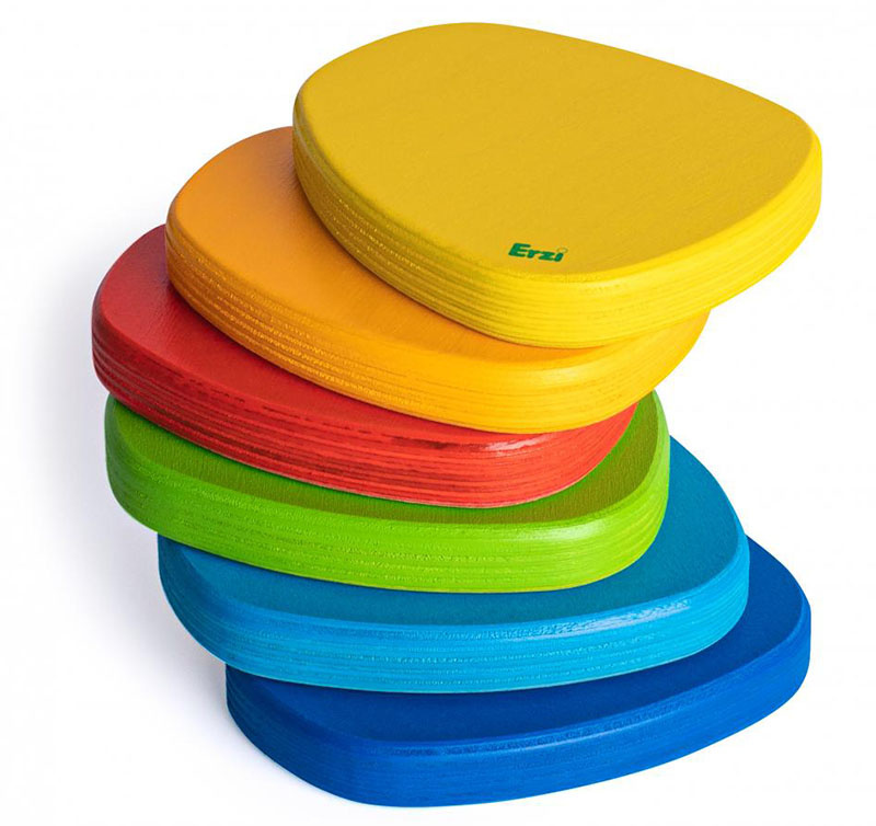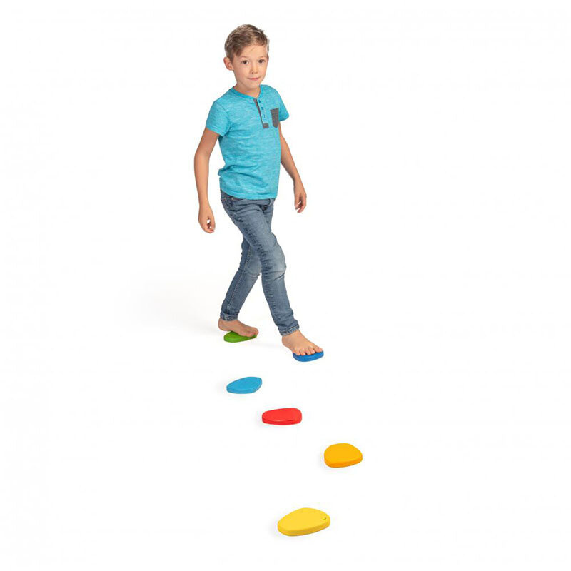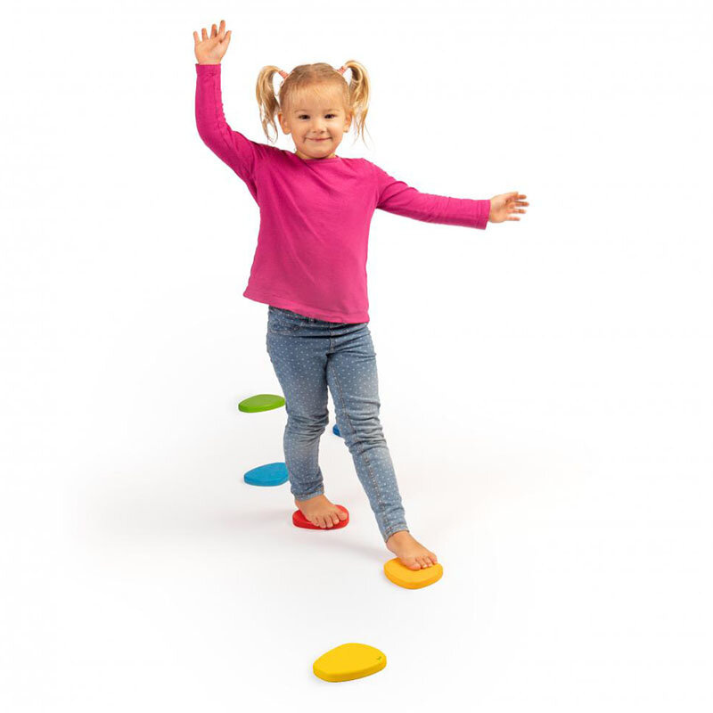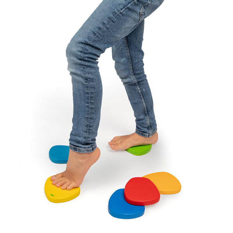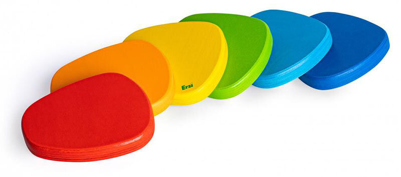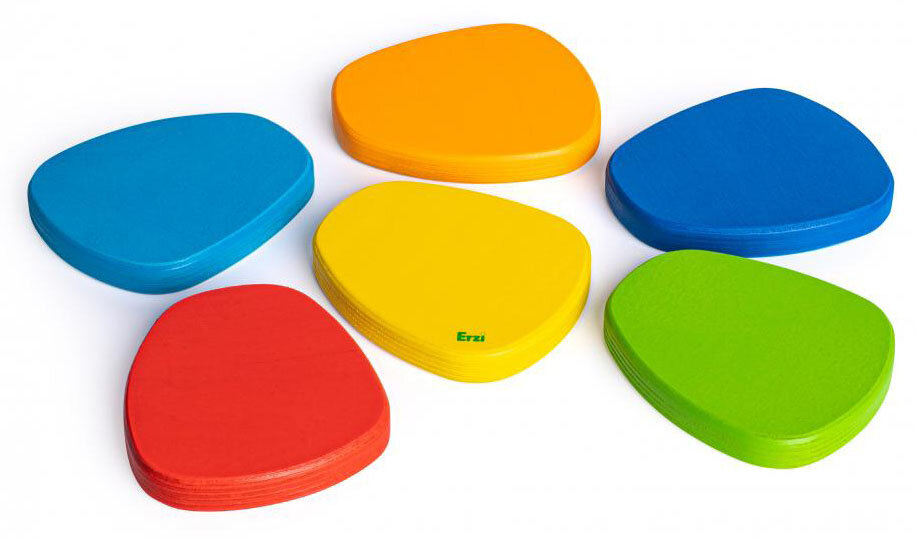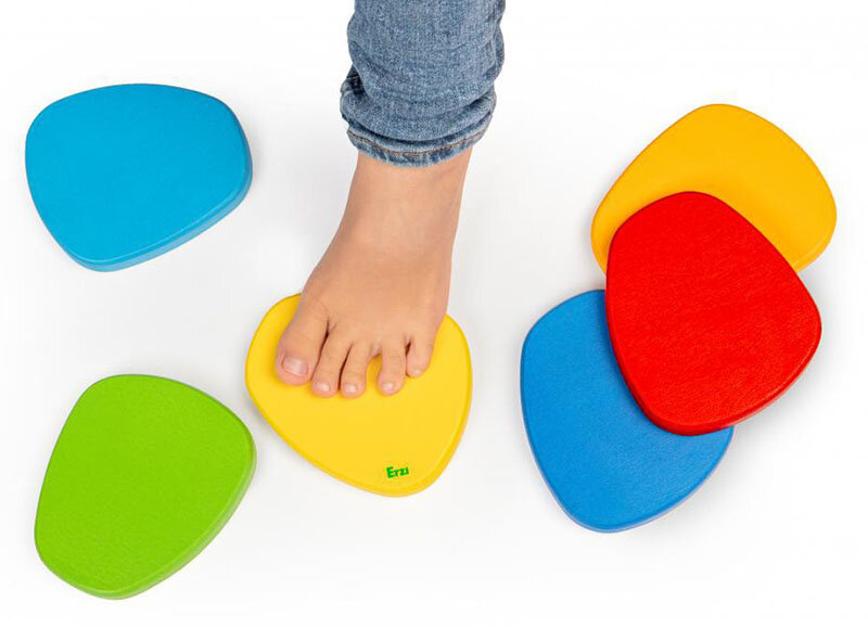 Ćwiczący równowagę zestaw klocków do balansowania marki Erzi to element, który warto wpleść w codzienną aktywność fizyczną dziecka. Klocki wykonane zostały ze sklejki brzozowej oraz pokryte je bezpiecznym, kolorowym lakierem. Bezpieczeństwo zabawy podnosi zastosowanie antypoślizgowych naklejek na wierzchu klocków. Klocki mają zaokrąglone narożniki i niewielką wysokość wynoszącą około 1,8 cm. Rozmiar poszczególnych kamieni jest idealnie dopasowany do dziecięcych stóp.