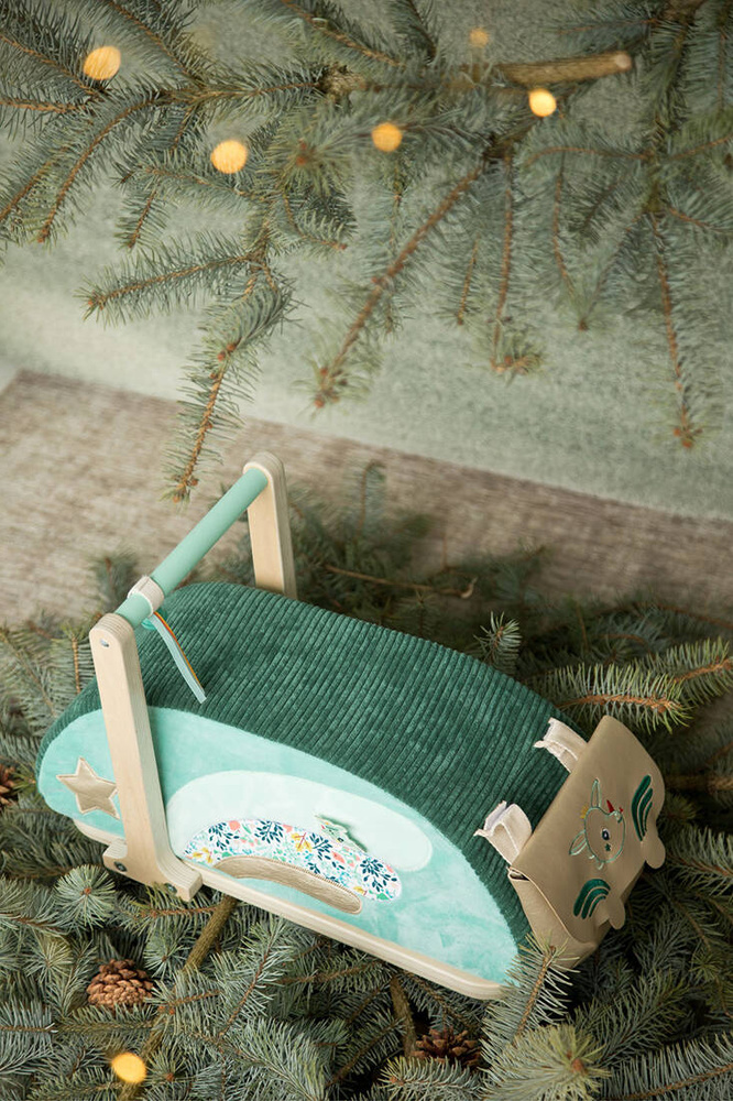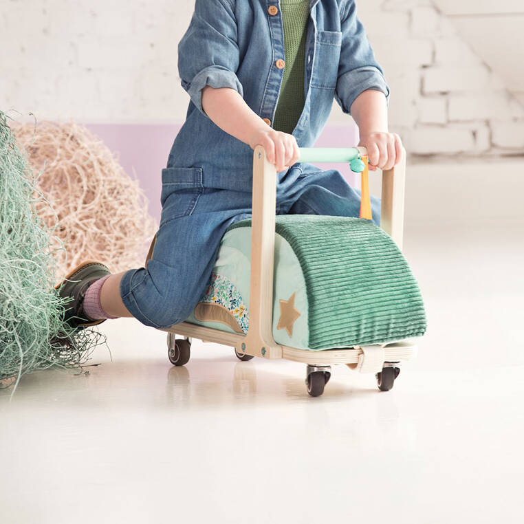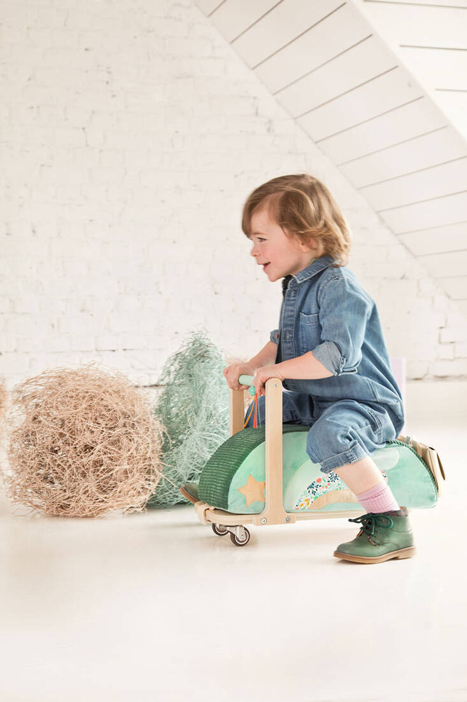 Drewniany jeździk to atrybut każdego małego miłośnika podróży i niezapomnianych przygód! Jeździk z kolekcji "Sarenka Stella" belgijskiej marki Lilliputiens to tzw. "mercedes wśród jeździków". Ten pojazd wspierający rozwój ruchowy dziecka został wyposażony w ergonomiczną rączkę i siedzisko o zaokrąglonym kształcie, które wyróżnia się m.in. pokryciem z bardzo miękkim futerkiem w modnym kolorze zielono - beżowym. Ten drewniany jeździk wyróżnia się na tle innych nie tylko ciekawym designem ale także ergonomiczną budową, optymalną wysokością czy też wyjątkowym komfortem jazdy. Obdarowane nim dziecko nie będzie miało żadnych, nawet najmniejszych problemów z wsiadaniem czy zsiadaniem z jeździka. Lekka konstrukcja sprawia, że pojazd ten prowadzi się bardzo łatwo. Kółka zamontowane w jeździku są szeroko rozstawione i wyjątkowo stabilne, a dwa z nich są skrętne. Maluch będzie czuł się w tym duecie jak ryba w wodzie. Co jest również istotne dla rodziców dziecka to fakt, że kółka w jeździku nie rysują podłogi podczas jazdy. Siedzisko jeździka można zdjąć z podstawy i używać jako oryginalnego dziecięcego krzesełka. Przy uchwycie kierownicy zamontowany jest dzwoneczek, a w tylnej części umiejscowiona została odczepiana torba ze skóry ekologicznej ozdobiona haftowaną buźką sarenki Stelli, do której maluch może włożyć i bezpiecznie przechować swoje skarby. Zabawka jest solidna, bezpieczna i zachwyca estetyką. Poruszanie się jeździkiem wpływa na rozwój sprawnościowy malucha, uczy utrzymywania równowagi i koordynacji. Te wszystkie powyższe argumenty bezdyskusyjnie udowadniają olbrzymią wartość tego dziecięcego pojazdu, dlatego też stanowi on idealny pomysł na prezent dla każdego maluszka od 12 miesiąca życia.