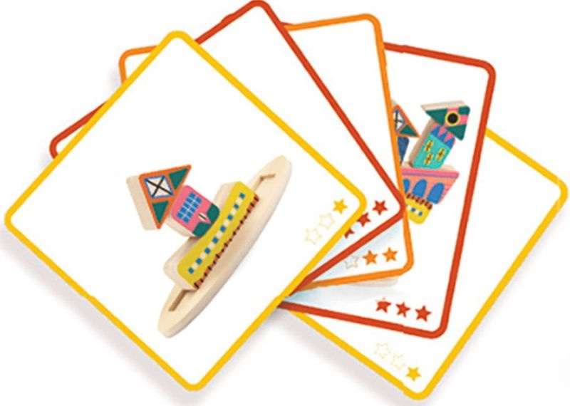 Projektanci drewnianego balansującego domku Djeco zapewnili łącznie 20 schematów do odtworzenia dostępnych w 3 poziomach zaawansowania.
