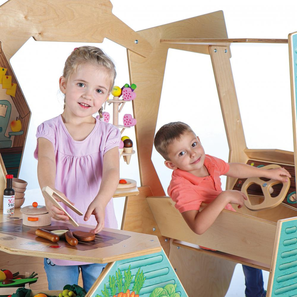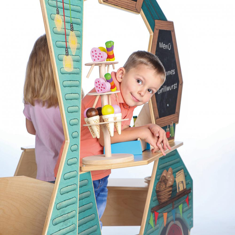 Erzi Food Truck posiada kabinę kierowcy wyposażoną w kierownicę oraz skrzynię zmiany biegów. W tylnej części pojazdu mali kucharze znajdą grill oraz odpowiednią ilość miejsca do przygotowywania posiłków. W części sprzedażowej znajduje się okienko do obsługi klientów oraz półki i tablice, na których można zaprezentować menu. Ten kolorowy Food Truck wyprodukowany został w Niemczech z wysokiej jakości materiałów.