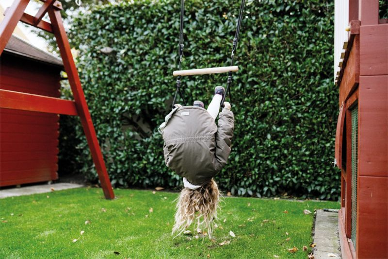 Huśtawka ogrodowa na drążku z kołami gimnastycznymi Small Foot wyposażona została w odporne na warunki pogodowe koła z metalu, które ułatwiają wieszanie i zdejmowanie huśtawki dla dzieci. Lite drewno zapewnia dużą wytrzymałość zestawu do zabaw na dworze – mogą z niego skorzystać i dzieci, i dorośli!