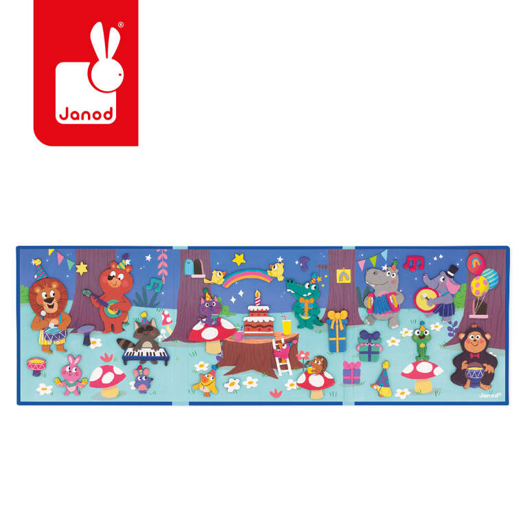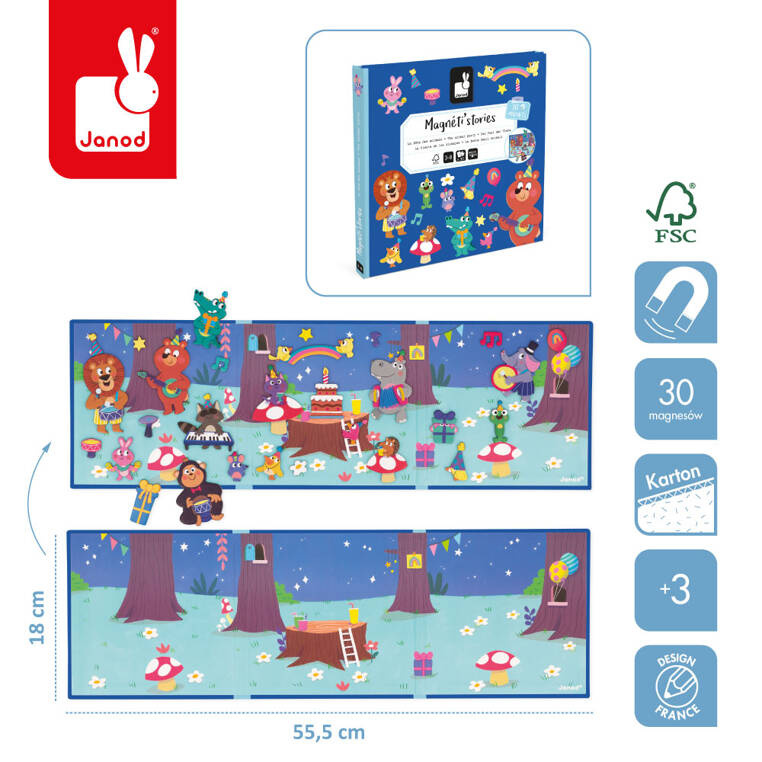 Magnetyczne historie Przyjęcie w lesie z linii Magneti'stories francuskiej marki Janod to prawdziwa gratka dla fanów imprez i leśnych zwierząt. Maluch otrzyma do dyspozycji 30 magnesów pod postacią leśnych zwierząt, gadżetów urodzinowych, imprezowych ozdób, prezentów itp., a w połączeniu z rozkładaną potrójną planszą stworzą przepiękną ilustrację. Magnesy układane są wedle własnej koncepcji, co sprawia, ze zabawka nie znudzi się szybko. Ta magnetyczna układanka jest chętnie wybierana przez rodziców na całym świecie. To nie tylko wspaniała rozrywka, ale także możliwość wielopłaszczyznowego rozwoju. Zabawa z tą układanką pobudza artystycznie, uczy kreatywnego podejścia do tematu czy też wspomaga sprawność manualną. To doskonały pomysł na angażujący prezent dla chłopca i dziewczynki.