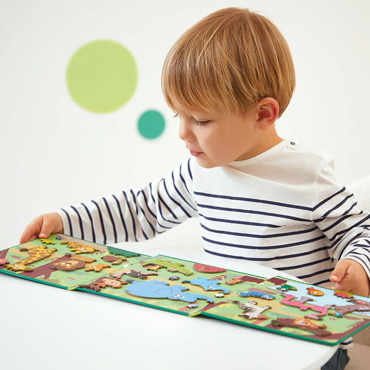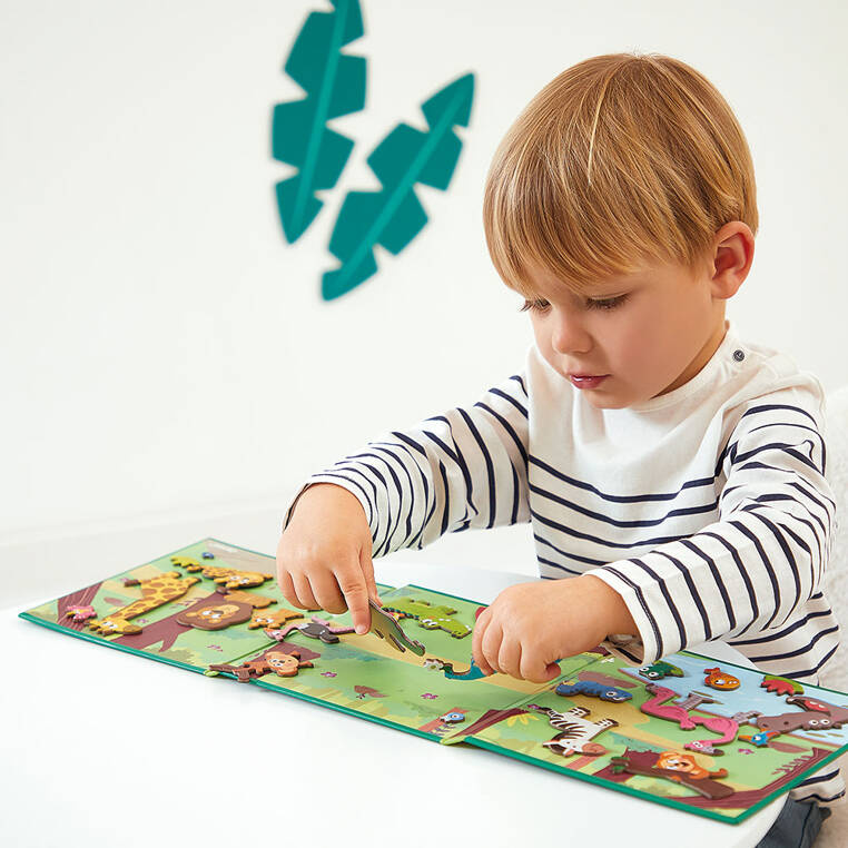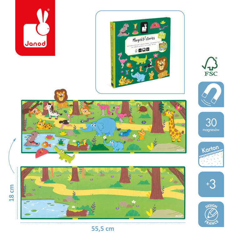 Magnetyczne historie Afrykańskie zwierzęta z linii Magneti'stories francuskiej marki Janod to prawdziwa gratka dla miłośników zwierząt i kontynentu afrykańskiego. Maluch otrzyma do dyspozycji 30 magnesów pod postacią różnych gatunków zwierząt rodem z Afryki ( żyrafa, zebra, słonie, małpka, krokodyl, flaming), a w połączeniu z rozkładaną potrójną planszą stworzą przepiękną, panoramiczną ilustrację. Magnesy układane są wedle własnej koncepcji, co sprawia, ze zabawka nie znudzi się szybko. Ta magnetyczna układanka jest chętnie wybierana przez rodziców na całym świecie. To nie tylko wspaniała rozrywka, ale także możliwość wielopłaszczyznowego rozwoju. Zabawa z tą układanką pobudza artystycznie, uczy kreatywnego podejścia do tematu czy też wspomaga sprawność manualną. To doskonały pomysł na angażujący prezent dla chłopca i dziewczynki.
