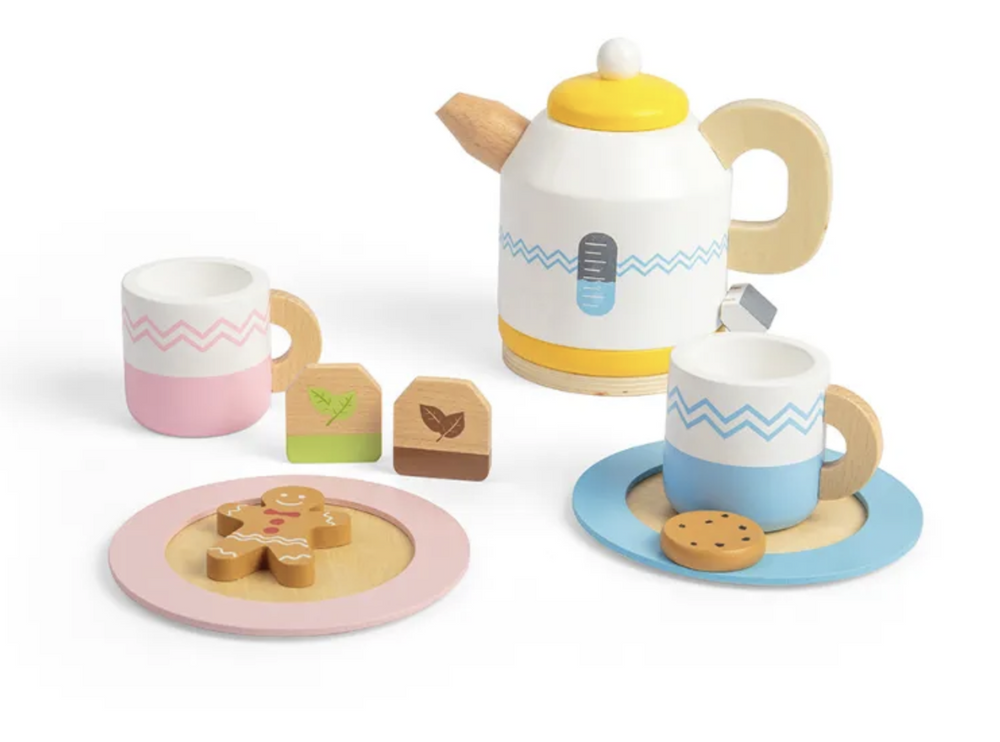 Gdy nadchodzi czas na podwieczorek, warto sięgnąć po drewniany zestaw do serwowania herbaty dla 2 osób Bigjigs!