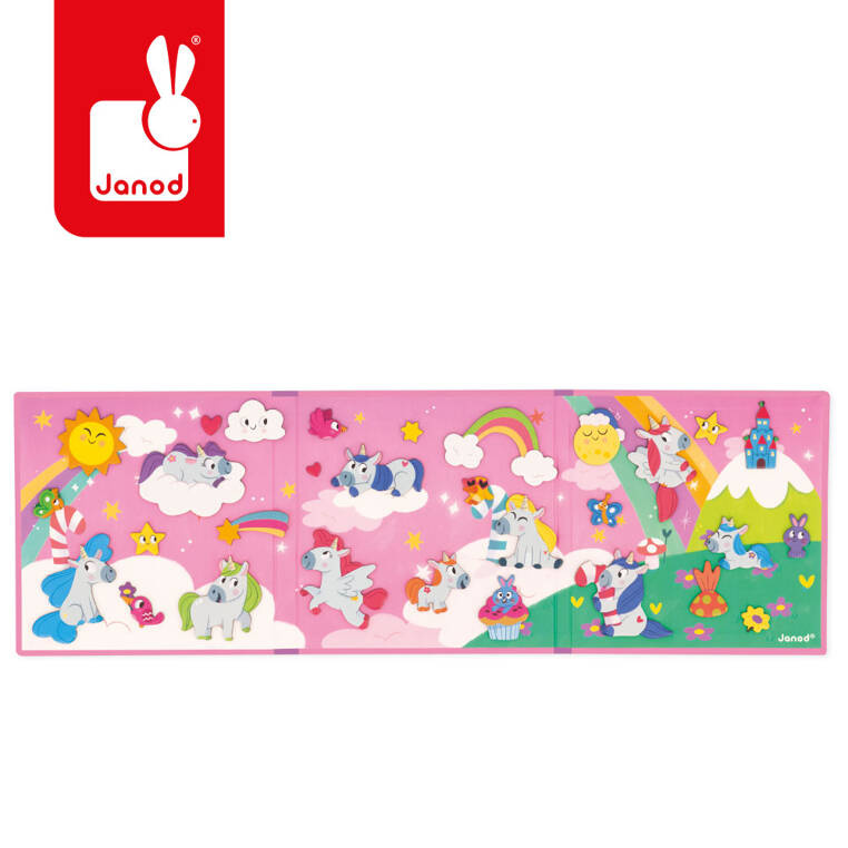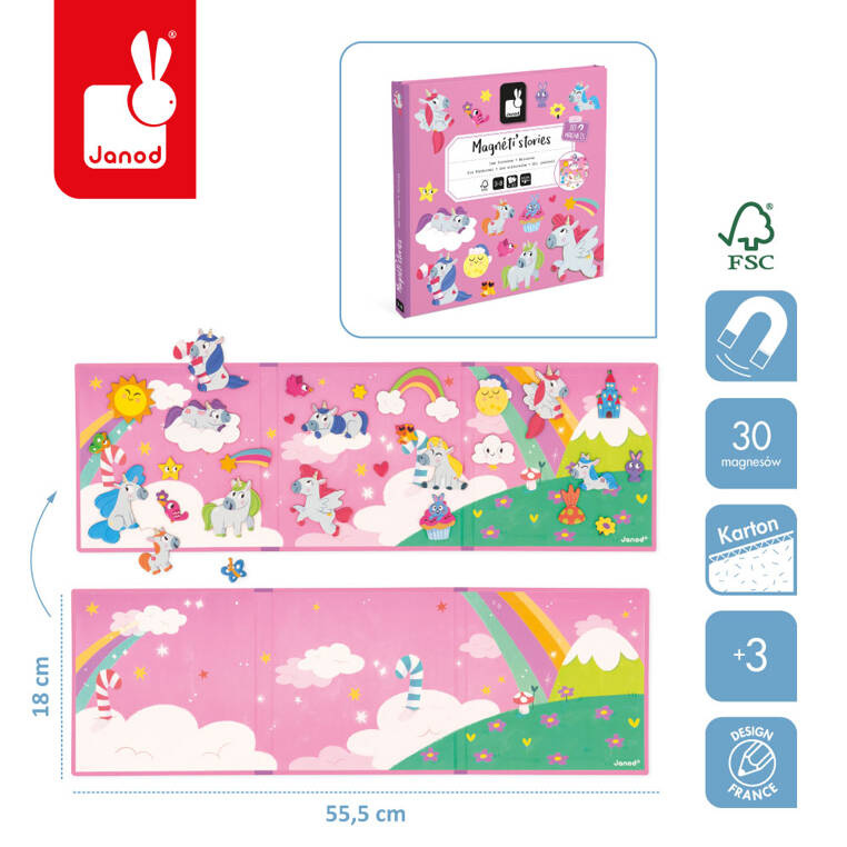 Magnetyczne historie Jednorożce z linii Magneti'stories francuskiej marki Janod to prawdziwa gratka dla fanów baśni i Jednorożców. Maluch otrzyma do dyspozycji 30 magnesów pod postacią jednorożców i innych elementów baśniowego krajobrazu, a w połączeniu z rozkładaną potrójną planszą stworzą przepiękną ilustrację. Magnesy układane są wedle własnej koncepcji, co sprawia, ze zabawka nie znudzi się szybko. Ta magnetyczna układanka jest chętnie wybierana przez rodziców na całym świecie. To nie tylko wspaniała rozrywka, ale także możliwość wielopłaszczyznowego rozwoju. Zabawa z tą układanką pobudza artystycznie, uczy kreatywnego podejścia do tematu czy też wspomaga sprawność manualną. To także doskonała okazja do bliższego zapoznania z Jednorożcami. To świetny pomysł na angażujący prezent dla chłopca i dziewczynki.