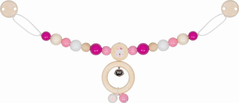 Mnóstwo drewnianych koralików zachęca do wyciągania rączek i pierwszych zabaw manualnych. W centralnym punkcie zawieszki do wózka z klipsami znajduje się obręcz do łapania z atrakcją w postaci dzwoneczka.