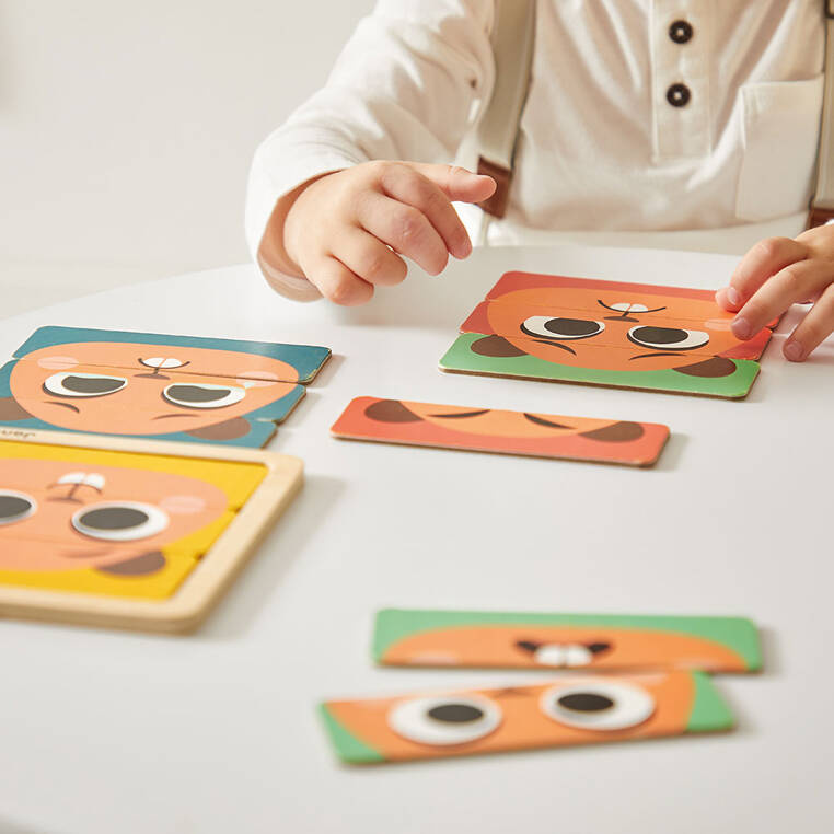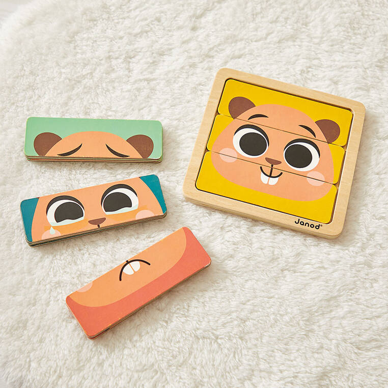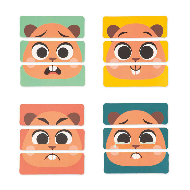 - układanka z 4 obrazkami do ułożenia, na których widnieją 4 istotne emocje: strach i złość, ale też radość i smutek– zabawka oprócz nauki rozpoznawania emocji zwiększa zasób słownictwa.