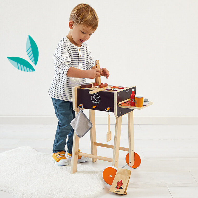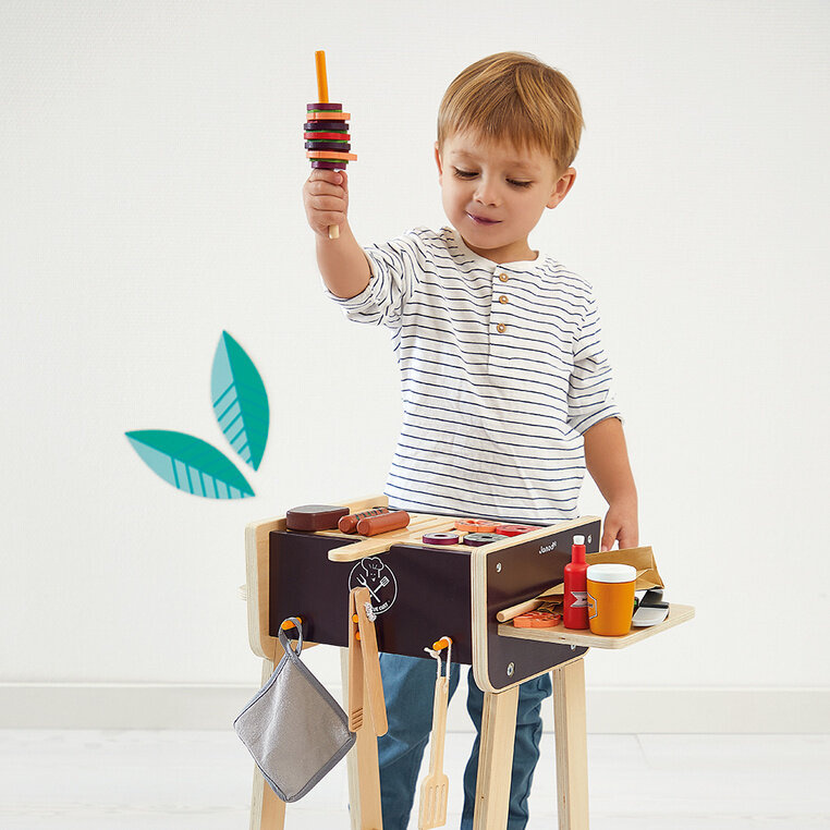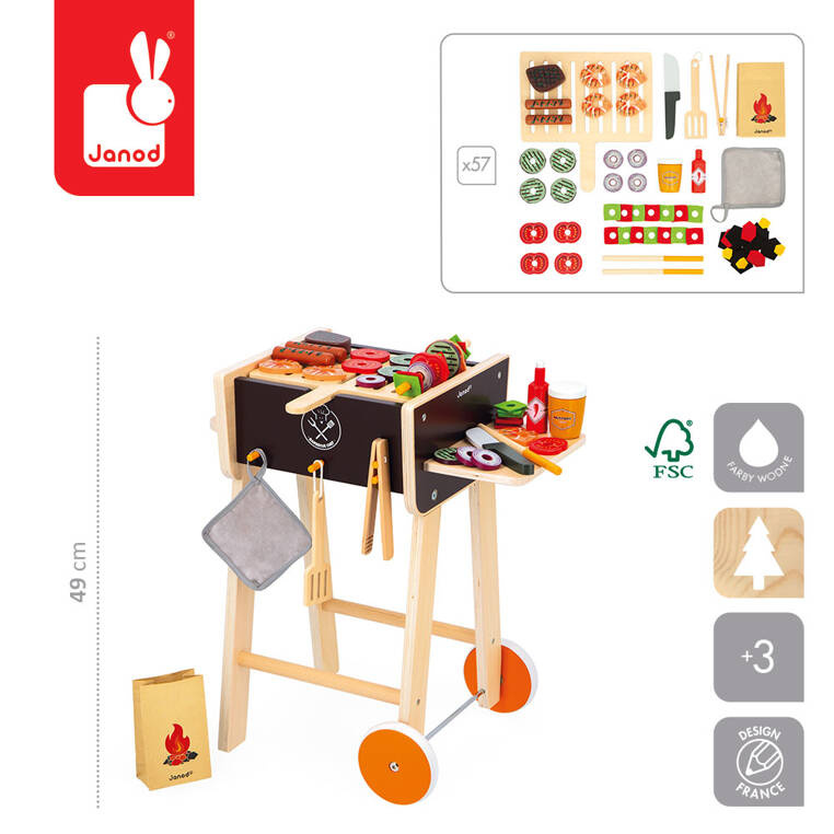 Duży, drewniany grill francuskiej marki JANOD sprawi olbrzymią radość każdemu maluchowi. Dzięki temu zestawowi dziecko będzie mogło bezpiecznie współuczestniczyć z rodzicem w kulinarnych przedsięwzięciach i rozwinąć przy tym swoją kulinarną pasję. W skład zestawu wchodzą: duży drewniany grill na stabilnych nóżkach z dwoma nierysującymi posadzki kółkami, boczną półką, uchwytem i 3 wieszakami z przodu na narzędzia, „jedzenie” z filcu i drewna, w tym m.in. steki kiełbaski, krewetki, warzywa, sosy, a ponadto worek węgla, szpatułka i szczypce, uchwyt kuchenny, patyczki do szaszłyków oraz nóż. Po zakończonej zabawie wszystkie elementy zestawu można przechowywać w grillu, co ułatwia zachowanie porządku. Podczas emocjonującej zabawy dzieci rozwiną i udoskonalą umiejętności z zakresu małej i dużej motoryki, jak również koordynację ręka-oko. Zabawa wraz z innymi uczestnikami wpływa z kolei na rozwój w sferze interakcji społecznych. Ten zaprojektowany we Francji zestaw do zabawy w grillowanie to doskonały pomysł na prezent dla chłopca i dziewczynki.