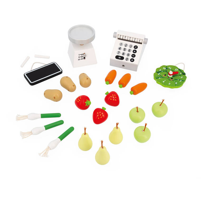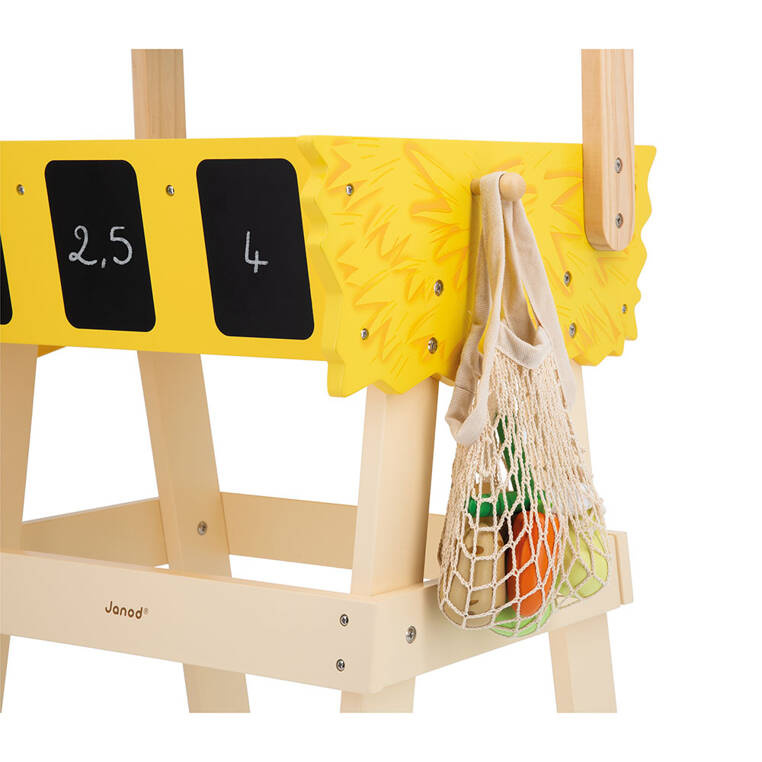 - drewniany stragan wyposażony w ladę i 6 dedykowanych skrzynek na owoce i warzywa ( każda z nich ma z przodu małą tabliczkę, na której można pisać kredą).