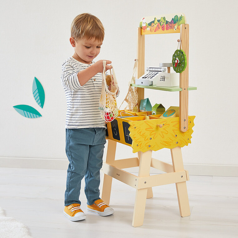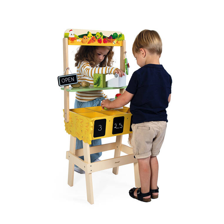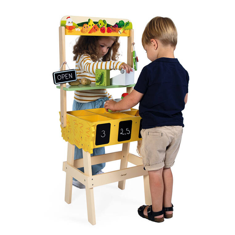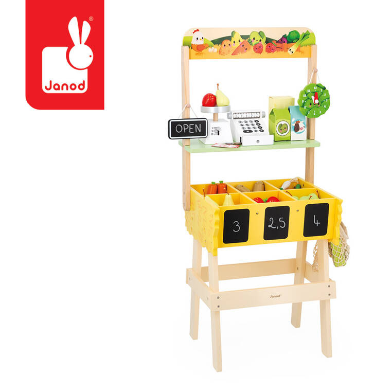 Dość dużych rozmiarów, stworzony na bazie drewna najwyższej jakości (z certyfikatem FSC), w pełni wyposażony sklep-warzywniak z kolekcji Farma francuskiej marki JANOD to idealna propozycja dla wszystkich fanów zabawy w zakupy i naśladowanie dorosłych. Dzieci mogą wcielić się w rolę sprzedawcy lub kupującego, a solidna, drewniana konstrukcja gwarantuje wspaniałą zabawę na wiele lat. Sklepik został wyposażony m.in. w specjalne skrzynki w pełni zintegrowane ze stoikiem, które zawierają także tabliczki do pisania kredą (można na nich zapisać dowolną treść np. cyferki oznaczające cenę bądź rodzaj warzyw, lub np. kraj ich pochodzenia). Zabawka wspomaga rozwój na wielu płaszczyznach: rozwija zdolności manualne, uczy cierpliwości, a także rozwija koncentrację. Niewątpliwym atutem tego drewnianego zestawu jest także możliwość nawiązania relacji społecznych, tym bardziej, że do wspólnej zabawy dziecko może zaprosi każdego. Maluch za sprawą miejsc do segregowania produktów, zlokalizowanych na stoisku, nauczy się dbać o porządek. Te wszystkie niewątpliwe atuty wpływają na fakt, że zabawka szybko się nie znudzi, a za sprawą wysokiej solidności jej wykonania, będzie służyła dzieciom przez lata. Elementy wykonane z drewna pomalowano z zastosowaniem farb w 100% bezpiecznych dla dzieci. Ten zaprojektowany we Francji zestaw jest dopracowany także pod kątem designu oraz wygody jego użytkowania. Zabawka została dopasowana wielkością do dziecięcych rączek. Całość została zapakowana w estetyczne, kartonowe pudełko, stąd też polecamy tę zabawkę na prezent.