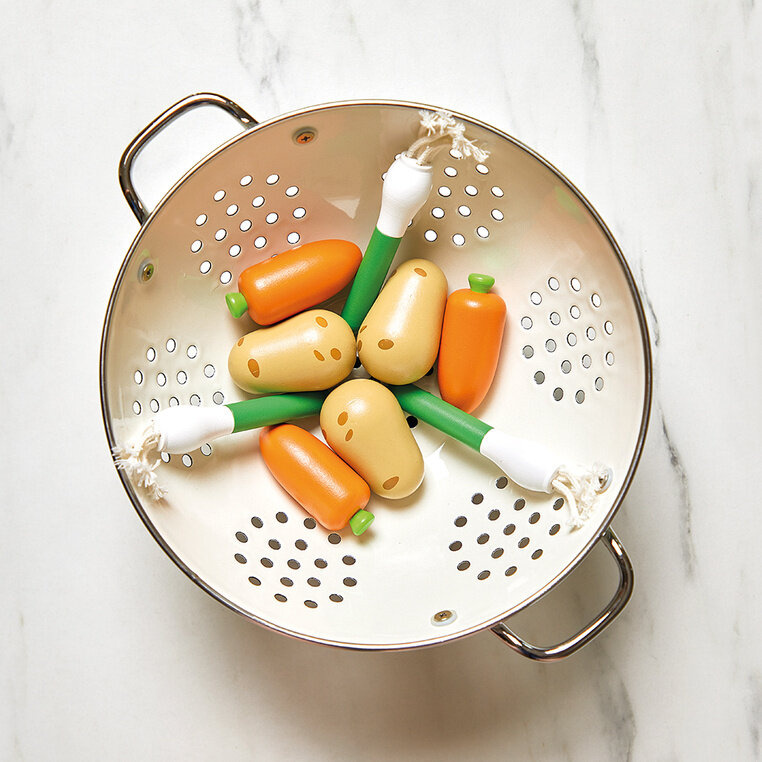 - 18 sztuk drewnianych owoców i warzyw (3 jabłka, 3 gruszki i 3 truskawki,3 marchewki, 3 ziemniaki, 3 pory).