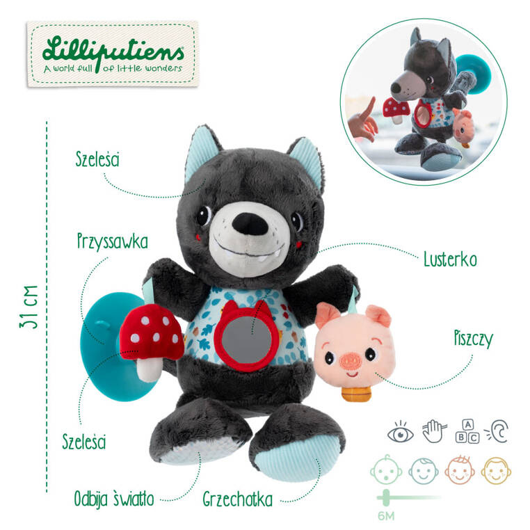 Znasz Wilka Louisa? To ten sam psotnik z bajki o Czerwonym Kapturku, tyle że w pluszowej wersji gotowej na nowe przygody! Lillputiens Wielofunkcyjna przytulanka na przyssawce Wilk Louis to nie tylko miękki towarzysz zabaw, ale i skarbnica odkryć dla małych odkrywców.