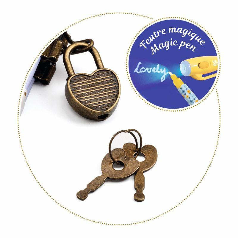 Sekretny pamiętnik z magicznym długopisem Kendra Djeco DD03624 notatnik dla dzieci to aż 88 kartek w linię gotowych do zapisania magicznym długopisem, który pisze niewidzialnym tuszem! Zapisane sekrety będą widoczne tylko w świetle UV. Latarka UV ukryta jest w skuwce długopisu, zasilana 3 bateriami LR44HD (w komplecie). W zestawie znajduje się również kłódka z dwoma kluczykami. Od teraz wszystkie sekrety będą bezpieczne.