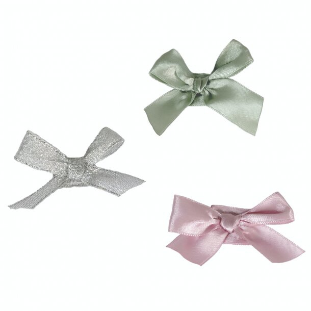 W zestawie znajdują się trzy wymienne kokardki w uroczych kolorach: srebrnym, pudrowym różu i pudrowej zieleni, dzięki czemu dziecko może dostosować swój wygląd do każdego stroju.